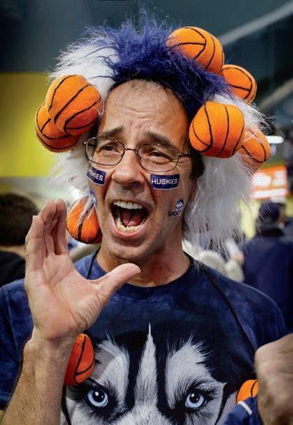 Nearby, lawyer and accountant Joseph Hurley is a human stat machine. As the Huskies widen their lead, he can tell you that they have won 24 straight NCAA tournament openers and haven’t lost back-to-back games in 882 games. Hurley will never forget his first Final Four—one of six he has attended—in Philadelphia in 2000.