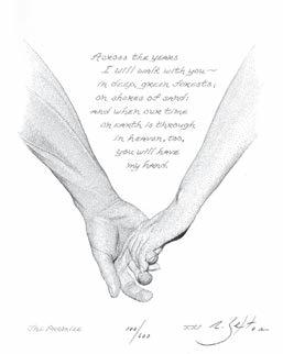 Now, I have decided to offer “The Promise” to those who share and value its sentiment. Each litho is numbered and signed by hand and precisely captures the detail of the drawing. As a wedding, anniversary or Valentine’s gift or simply as a standard for your own home, I believe you will find it most appropriate.