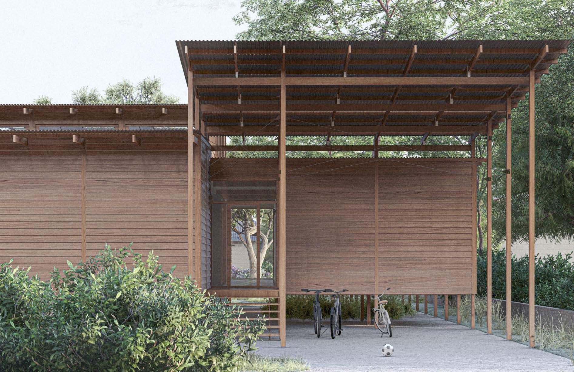 Inspired by the House of Chau Doc by NISHIZAWAARCHTECTS, the project approaches a common residential site in Houston with a vernacular approach, shedding the inhabitants with a series of sloped roof pieces. The roof pieces are supported by a 4x4 timber columns that form a tight grid, exposing the wood in the interior. Drawing from the prevalent timber construction methods in the United States, the design adopts a post-and-beam system as a reinterpretation of the conventional tilit-up approach.