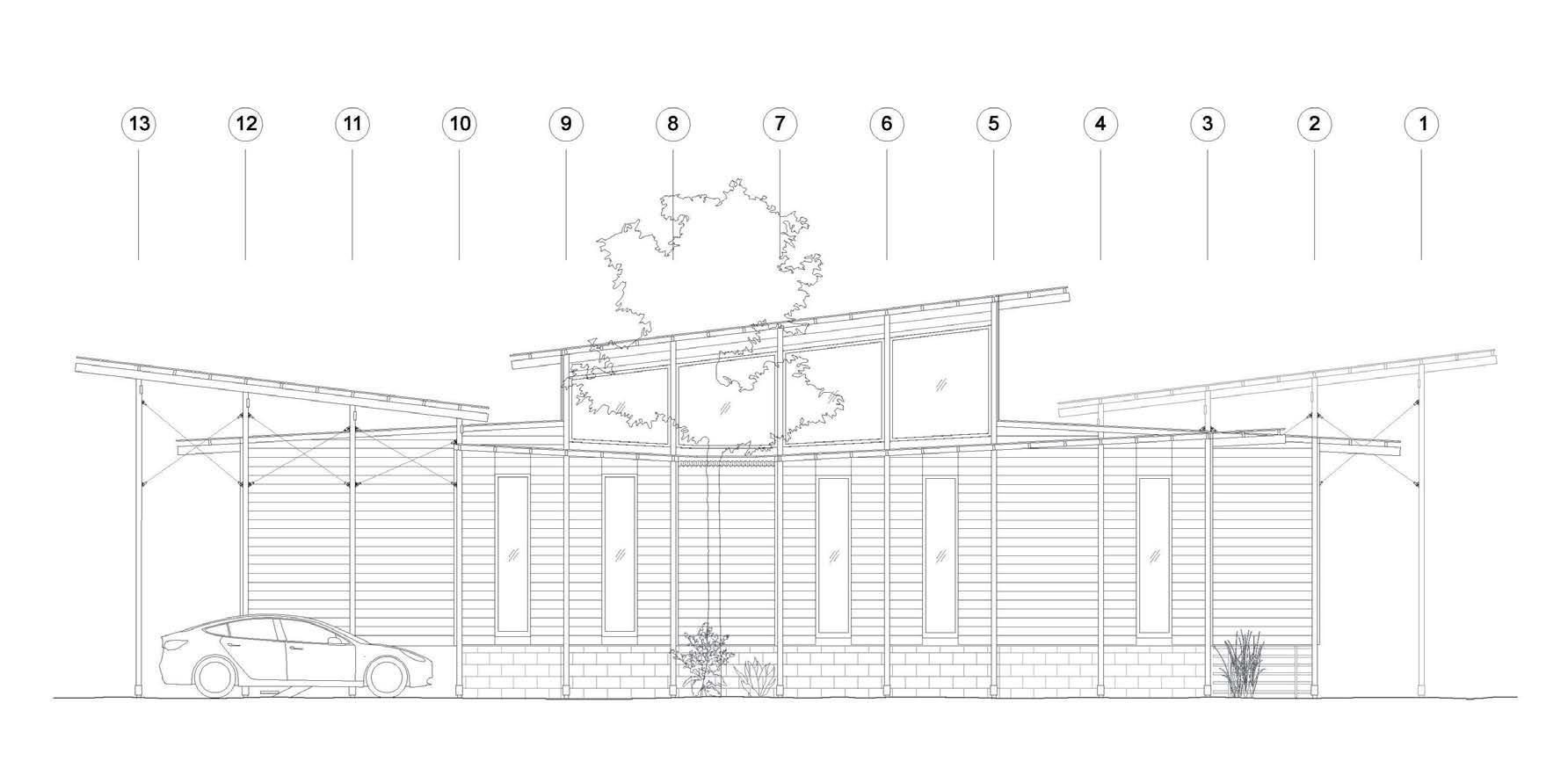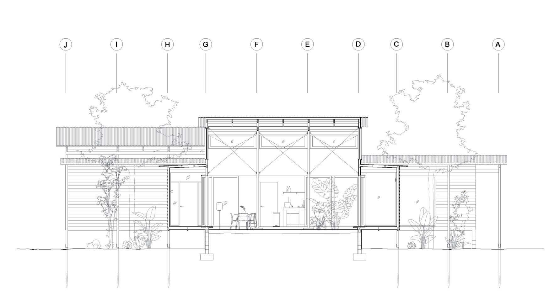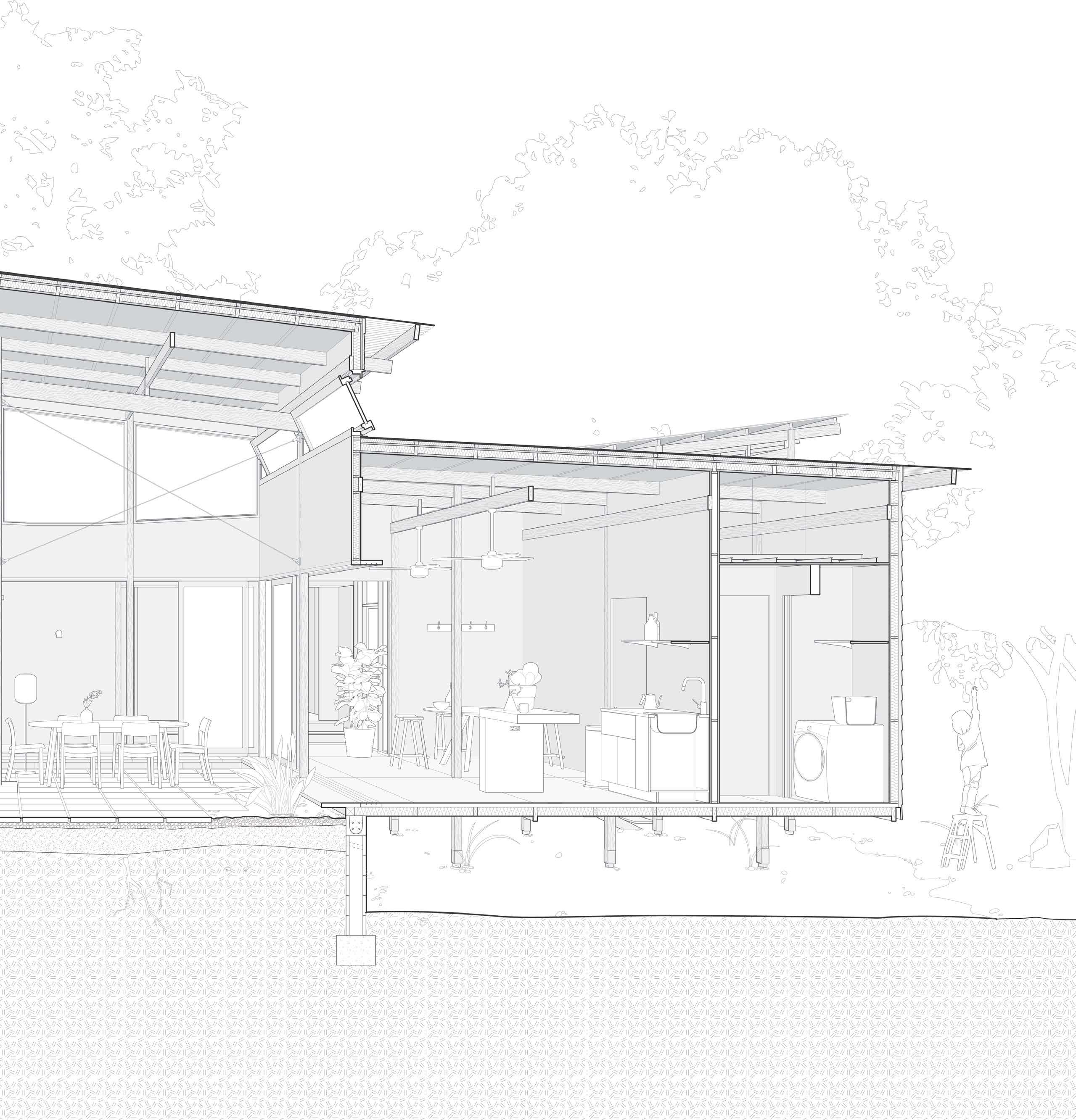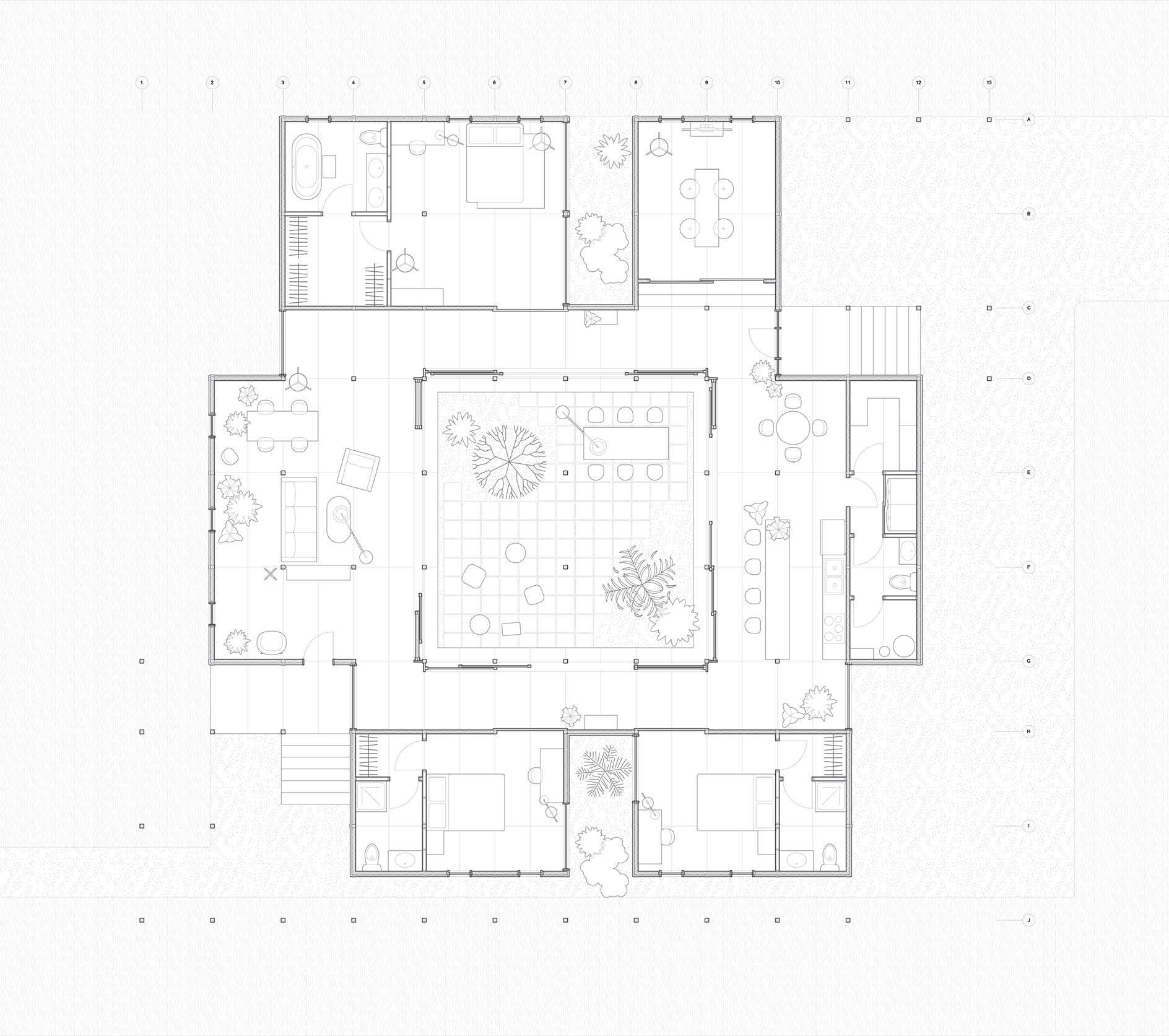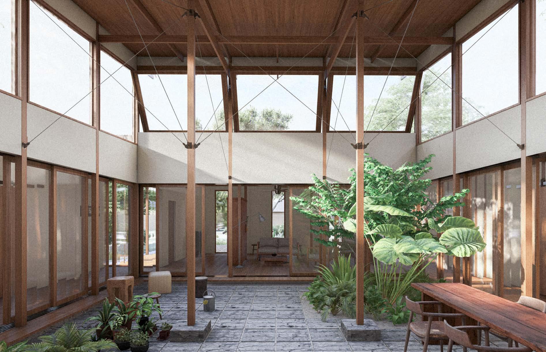 The house is elevated three feet above ground on a foundation of ground screws, addressing Houston’s susceptibility to flooding. A series of rooms are centered around a central courtyard that acts as a climate mediator. Blending between the indoor and outdoor, the central courtyard opens up to allow for ventilation during the summertime and insulates itself to provide a sunroom when the weather gets cold. By integrating these adaptive features, the house not only responds to climatic conditions but also offers an alternative living experience rooted in local construction traditions.