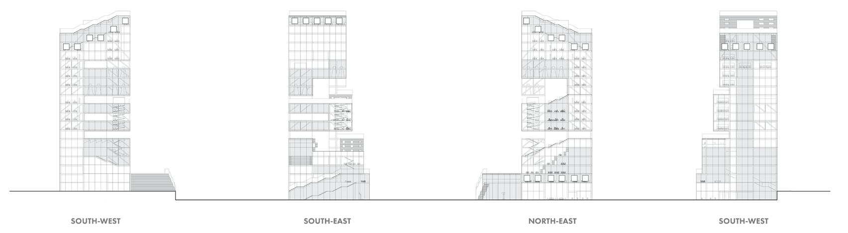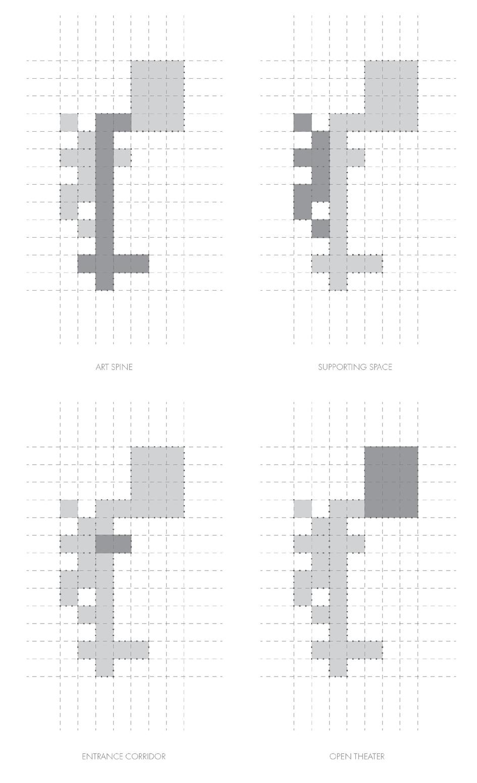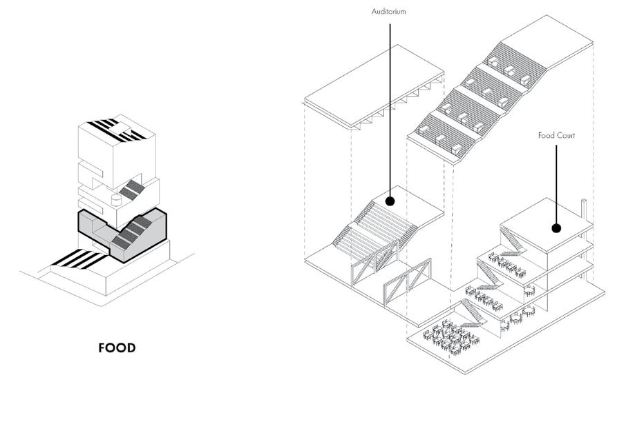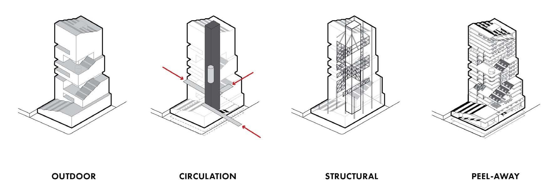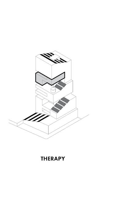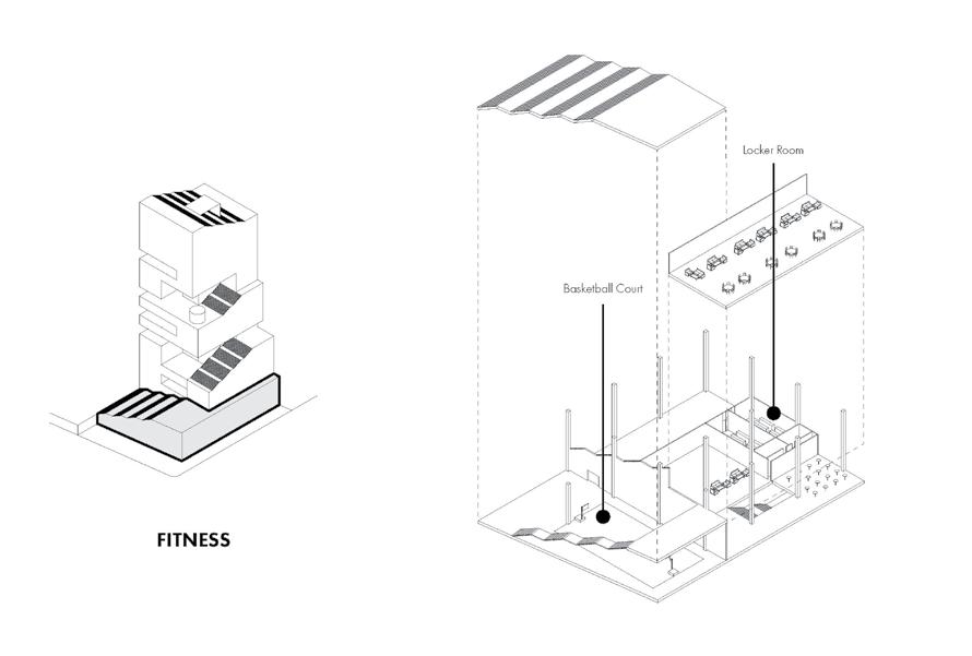 There are five main programs of this vertical community center: Fitness, Food, Art, Therapy, and Workspaces for non-profit organizations. These programs corresponds to important aspects of one’s mental health such as exercising, eating healthy, meditating, and having a sense of community. Moving from bottom to top in elevation, the programs are organized in a way that goes from loud to quiet, from physical to mental, from body to mind, and from collective to individual. Variations of voids were then added in between the volumes for a public access of elevated outdoor spaces. These spaces will demonstrate properties from known successful public spaces such as the Paley Park, the Edge, and the Spanish Steps.