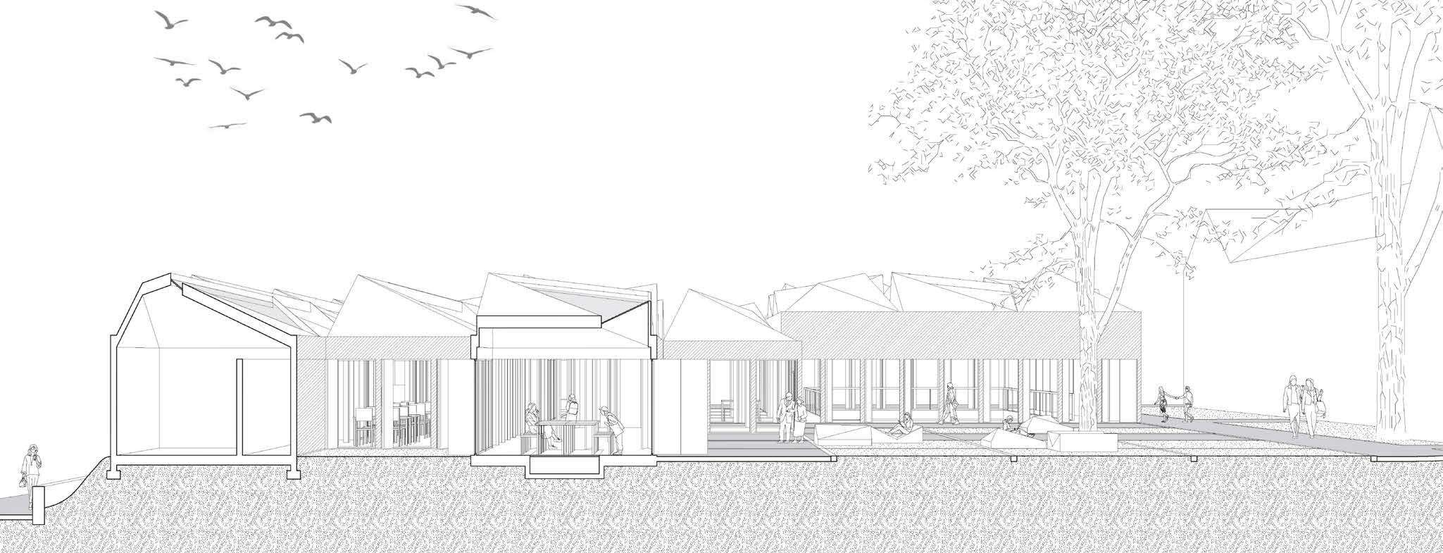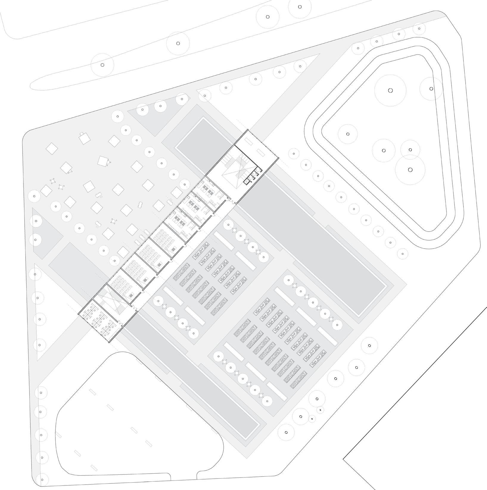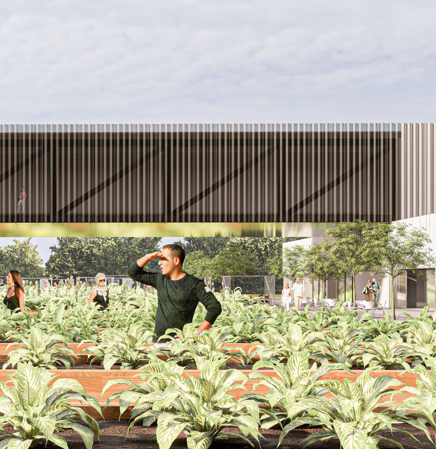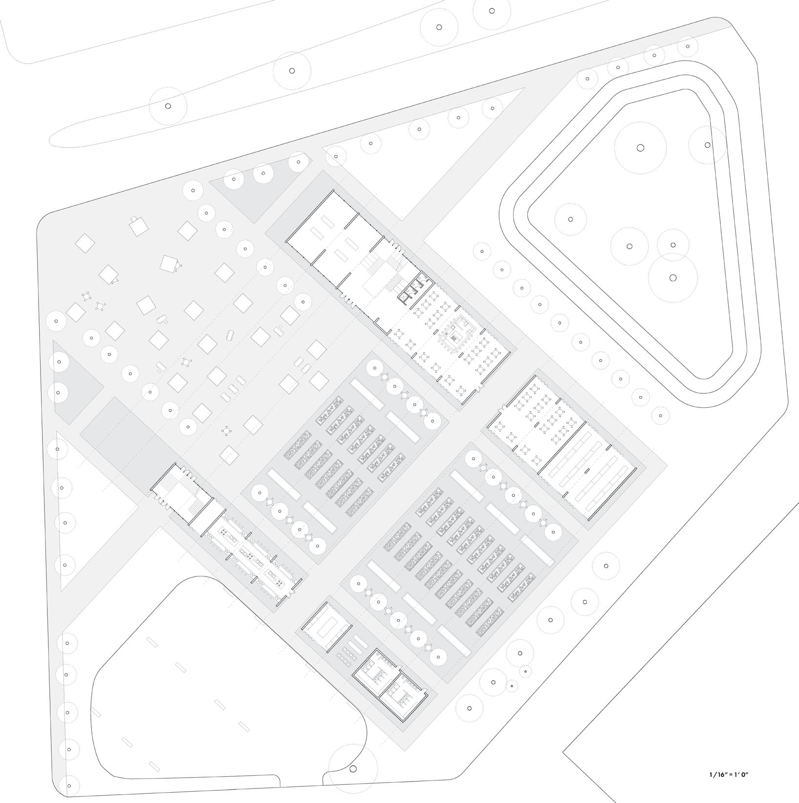 Addressing the corner of the site, two long concrete bars of communal and production activities enclose an outdoor area for gardening and food market. The metal volume for educational programming rests atop the two concrete volumes as a gateway to enter this public outdoor space. The conditioned volumes of the project serve as a muted backdrop, framing various outdoor elements of the site, and providing the community with a food production space that simultaneously serves as a public park facility.