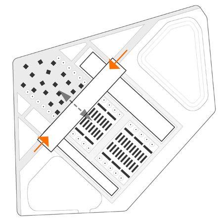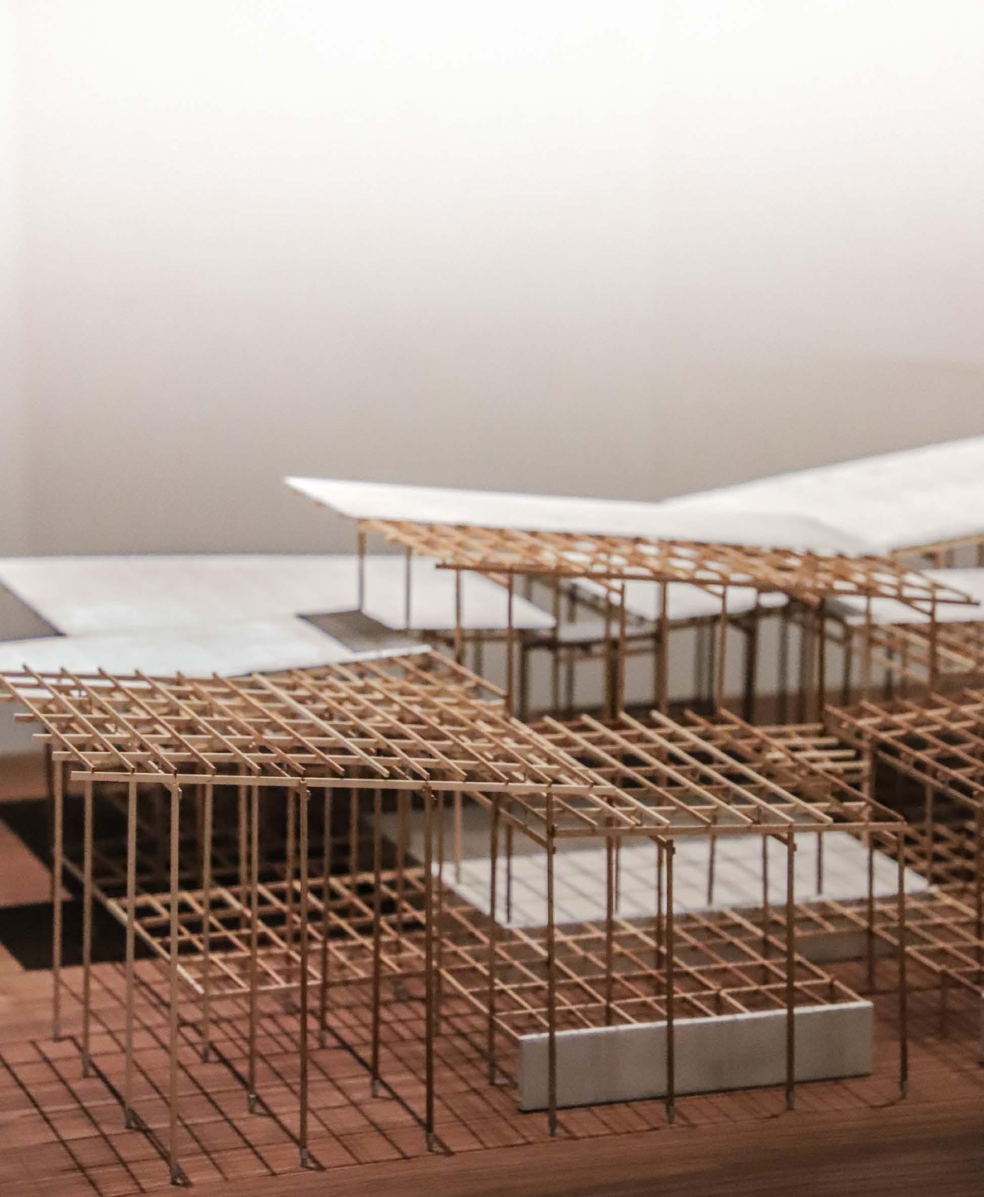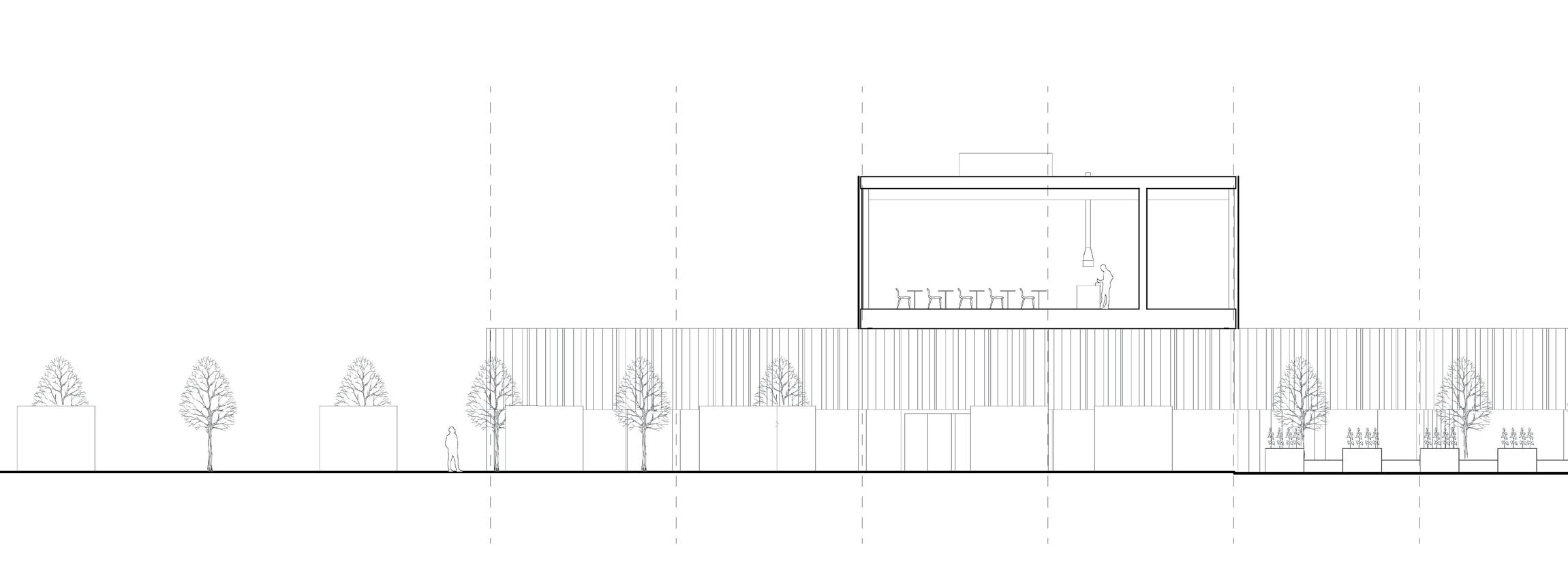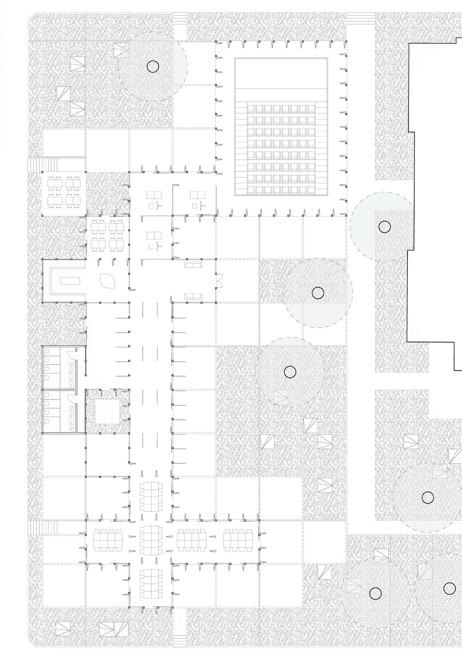 Addressing the corner of the site, two long concrete bars of communal and production activities enclose an outdoor area for gardening and food market. The metal volume for educational programming rests atop the two concrete volumes as a gateway to enter this public outdoor space. The conditioned volumes of the project serve as a muted backdrop, framing various outdoor elements of the site, and providing the community with a food production space that simultaneously serves as a public park facility.