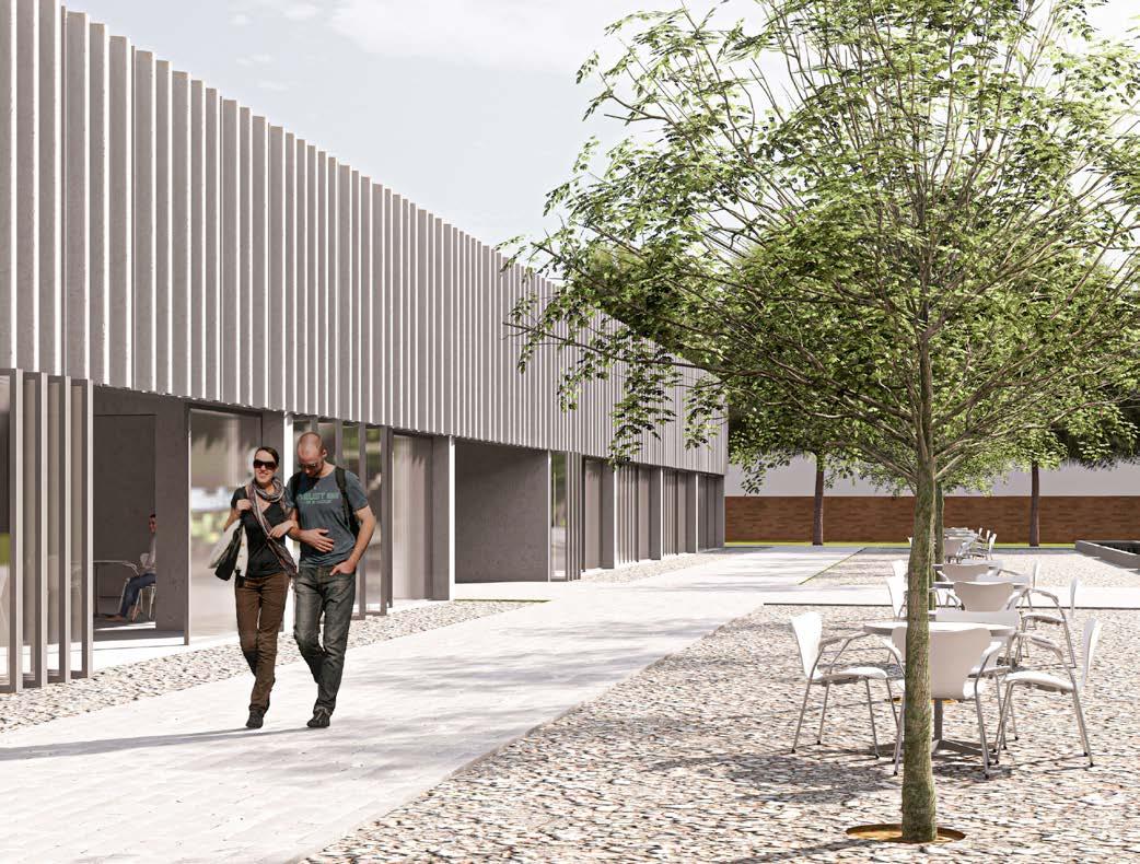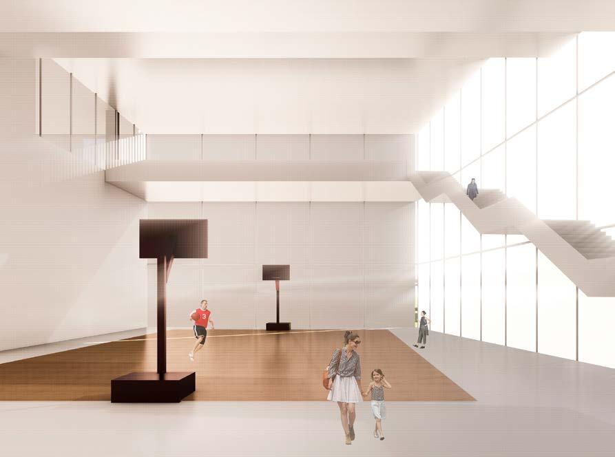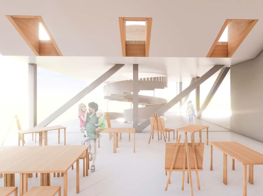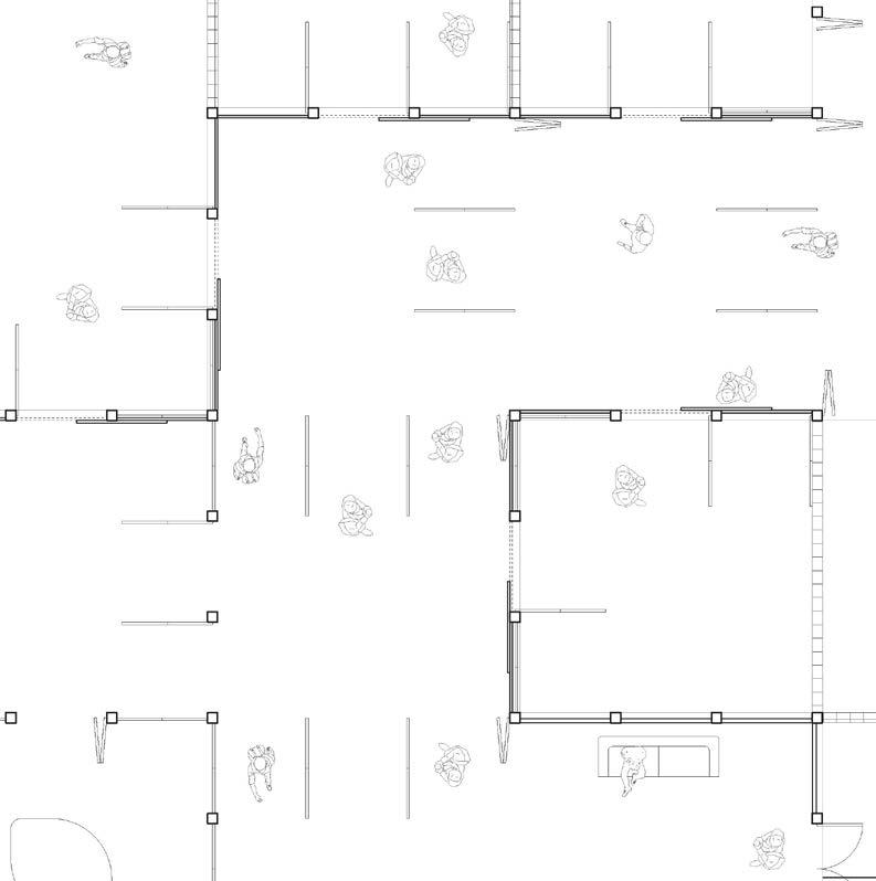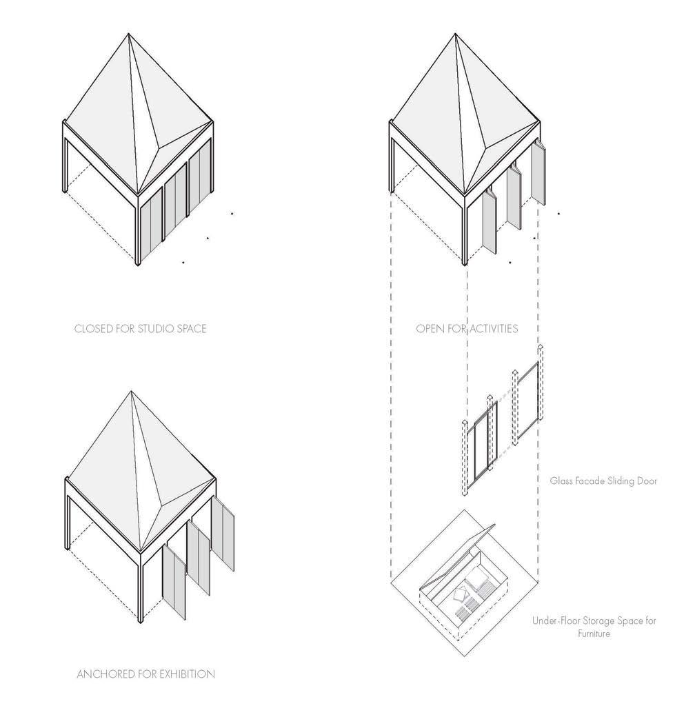 Concrete is selected as the structure for the ground level as an extension of the foundation. While the education bar atop needs to span, a steel truss structure is utilized. This duality of light and heavy is also reflected on the facade as the second floor is cladded with galvanized steel panel, and the ground floor is cladded with pre-cast concrete panels. Treating the roof of the ground floor and the bottom of the second floor as the “fifth-facade”, they are designed to reflect the ground condition.
