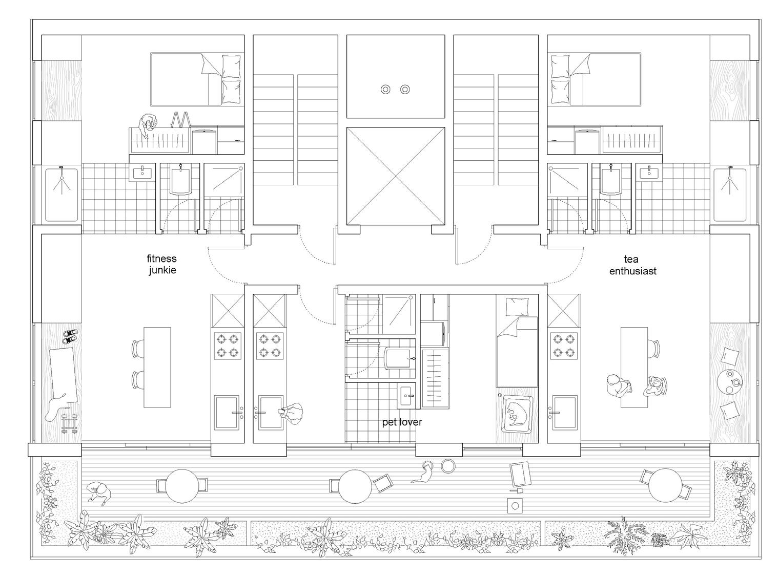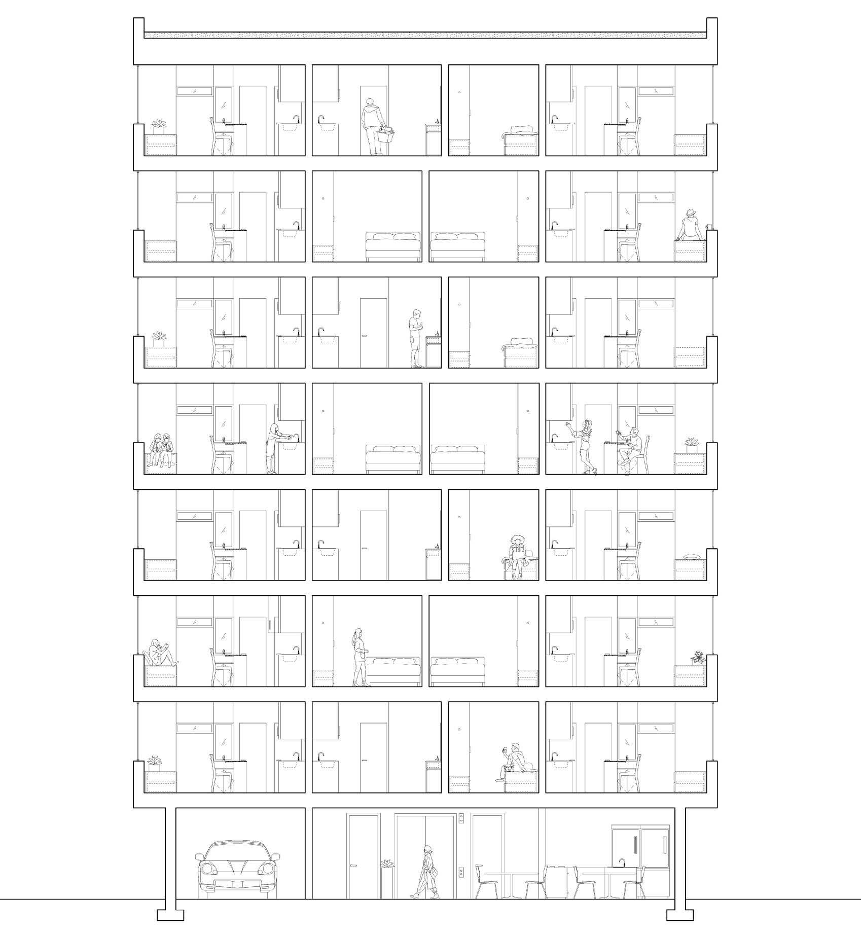 The core idea of this project begins with minimzing square footage for essential needs while allocating a band of space that allows for the expression of individual idiosyncrasies. This approach not only optimizes space utilization but also encourages a sense of ownership and belonging among the residents
