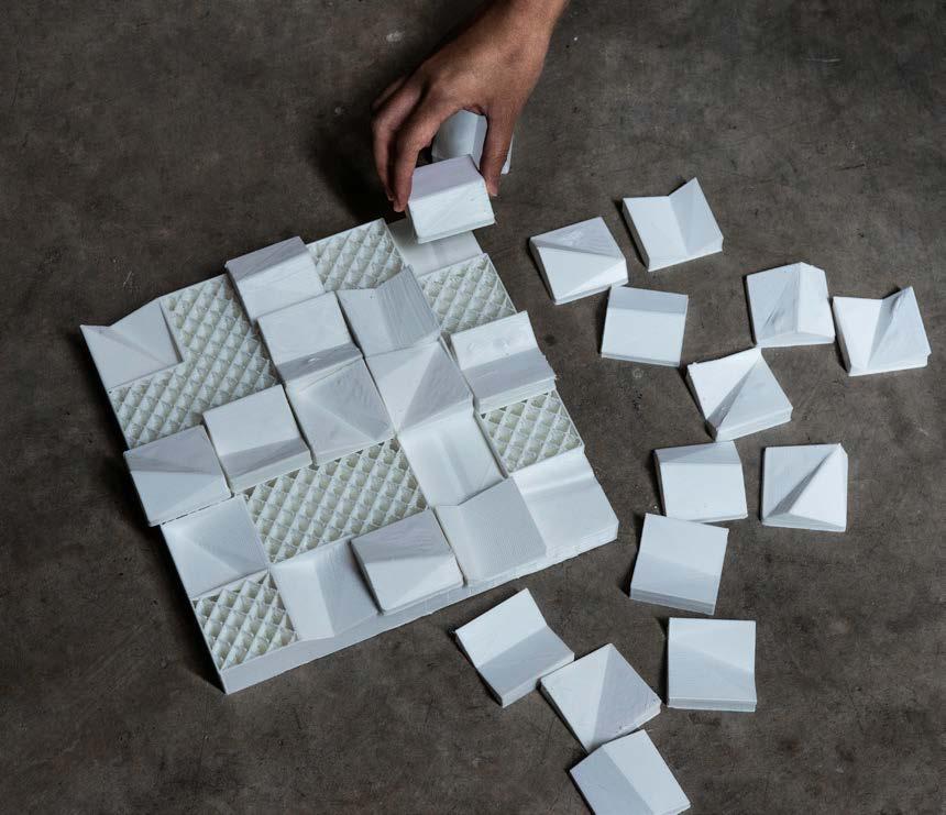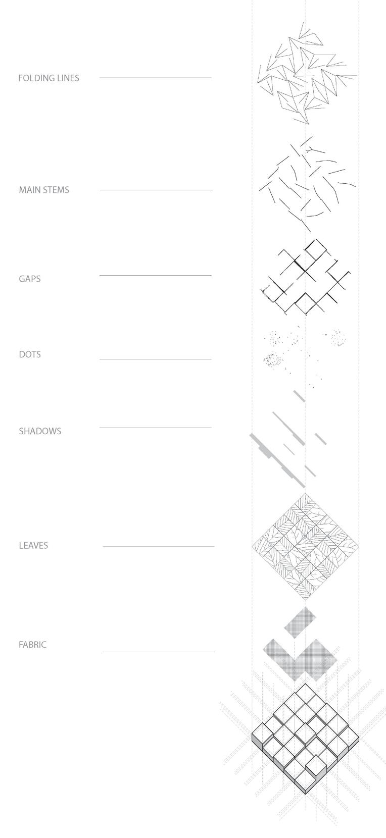 The exploration of pixelation art pushed for the generation of floor plan as well as the roof structures. Detailed analyzation through linework was created immediately after the initial concept model made with leaves. The directionality of main stems were turned into folding lines that generated the three dimentional iteraction on the right.