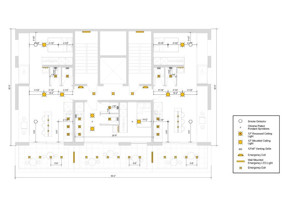 The dining area is illuminated by daylight washing through the skylight and windows. Positioned toward the street, it provides both table and booth seating for hotel guest and those looking for a sojourn from their travels.
