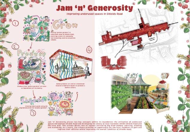 As my previous studio group stated, ‘jam’ will be the media for Byker community’s economic and cultural revitalization. Berries and wheats grow through the sky garden on third floor of co-housing building, then transport to ground floor bakery to process into jam and other peripheral food products like pancakes, tarts, biscuits etc., and then bring it to our newly-built pavilion in Hadrian Square on Shields Road to sell to the public, finally the money will be used to build the learning hubs on the first floor of building for local residents.