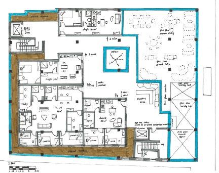 -The inclusion of a wide and convenient ramp around the atrium tree on first floor between the level change of shared kitchen and shared dining area emphasizes the importance of accessibility, making the communal space welcoming to people of all abilities.