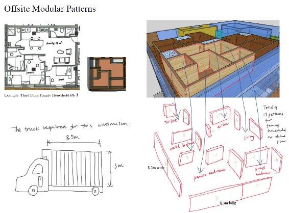 Moreover, offsite construction method helps to make modular building patterns. In this project, timber walls for households and timber decks on shared terraces will be made modularly.