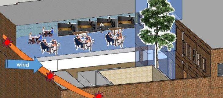 The construction of the doublelevel bakery kitchen between the ground floor and the first floor, the atrium tree that runs from the ground floor to the top floor, the cut-out below the sky garden on the third floor, the large area of glass curtain wall at building façade , the connection between the existing brick wall and the curtain wall at the back of the building all required the guidance of a structural engineer.