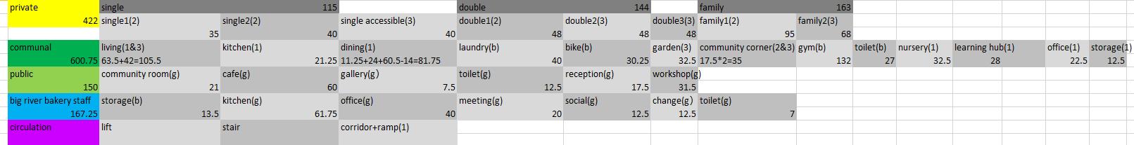 -Land Use: On basement, there are bike storage, gym, laundry for residents, and storage for Big River Bakery. On ground floor, there are Big River kitchen ,café, gallery, workshop room and staff space, community room and toilets. On first floor, there are shared living, dining, kitchen, nursery and learning hub for community. On second and third floor, there are eight households with shared terraces, community corners on each floor and finally community garden.