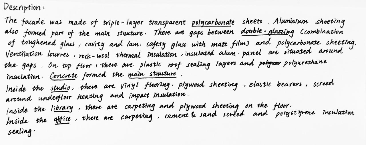 This essay analysed five themes, several drawings and pictures of Laban Centre by word description and tracing works.
