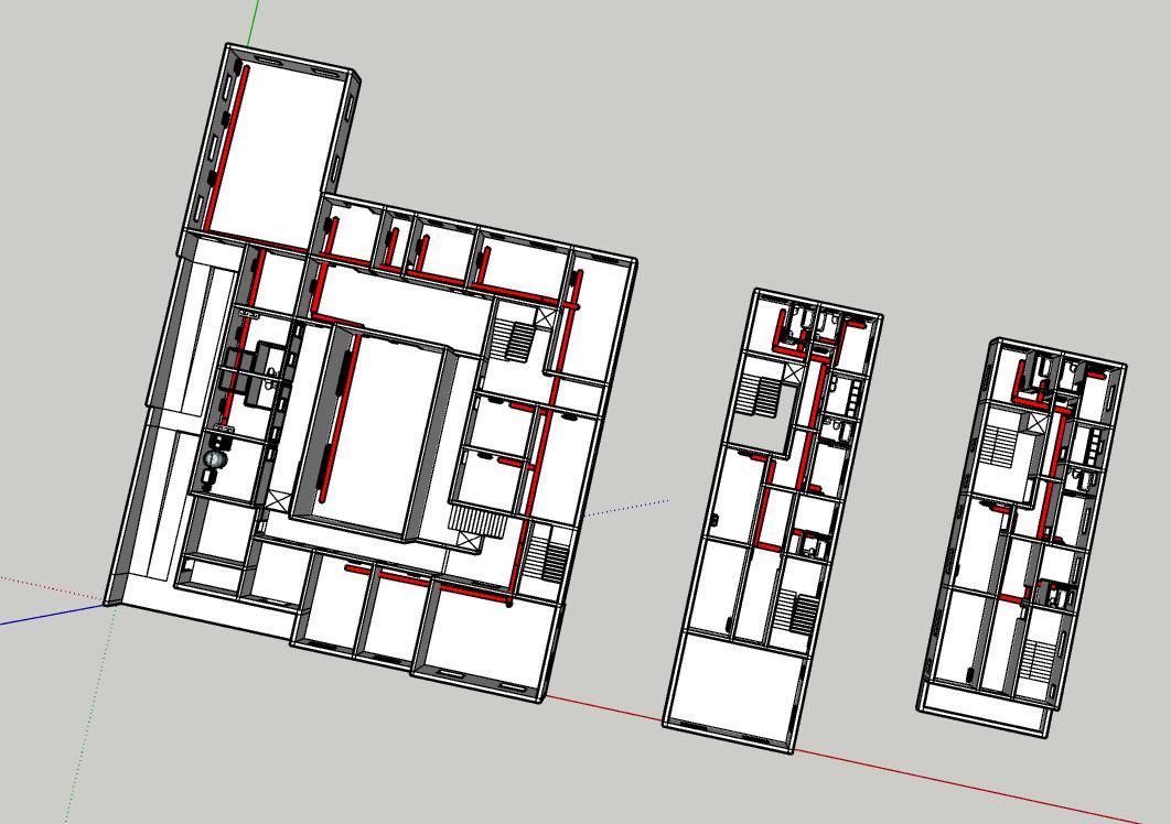 Fig 136-138.Escape Stairs locations marked in buildiing model. Author's own work.