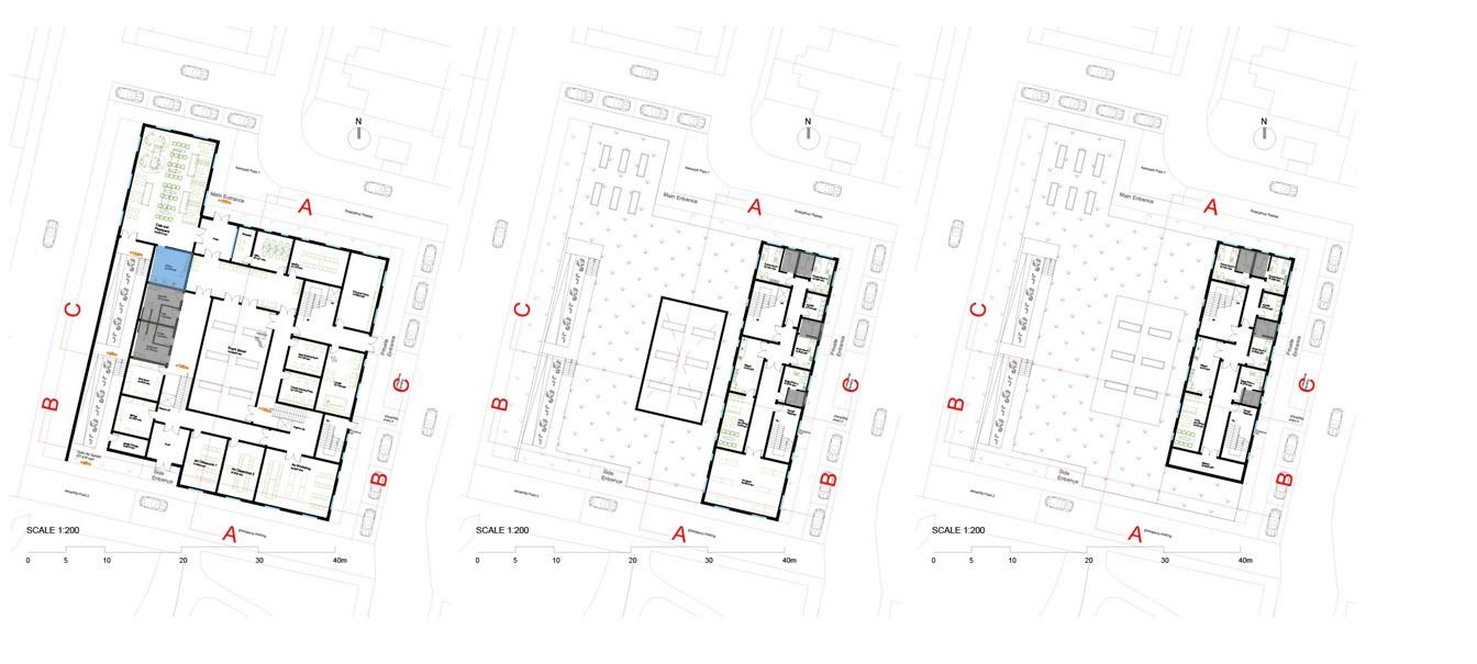 Fig 83-85.Ground, first, second floor plans with plant room highlighted in red, ground floor public toilets, first floor and second floor toilets highlighted in grey and ground floor kitchen highlighted in blue. Author's own work.