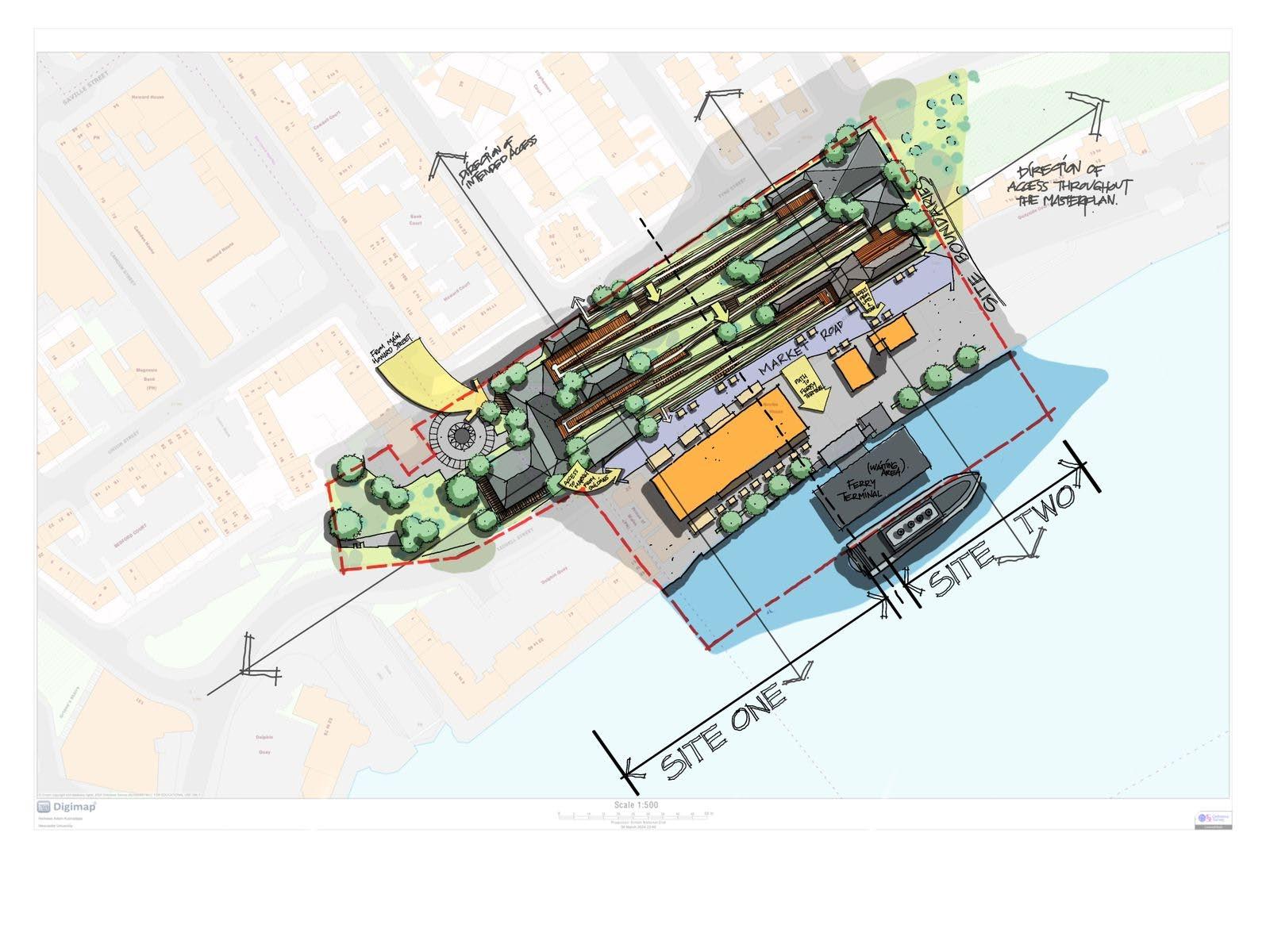 Our group decided to develop a zigzagging ramp covering most of the forest belt, add marketplace near the new ferry landing point on Liddell St, design a circle-shaped square for Tyne St. The site one and site two were two big division of site for our group members to choose where to locate their building and all of us chose the first one mainly because its advantage of being close to Howard St, a huge convenience to connect city centre and quayside.