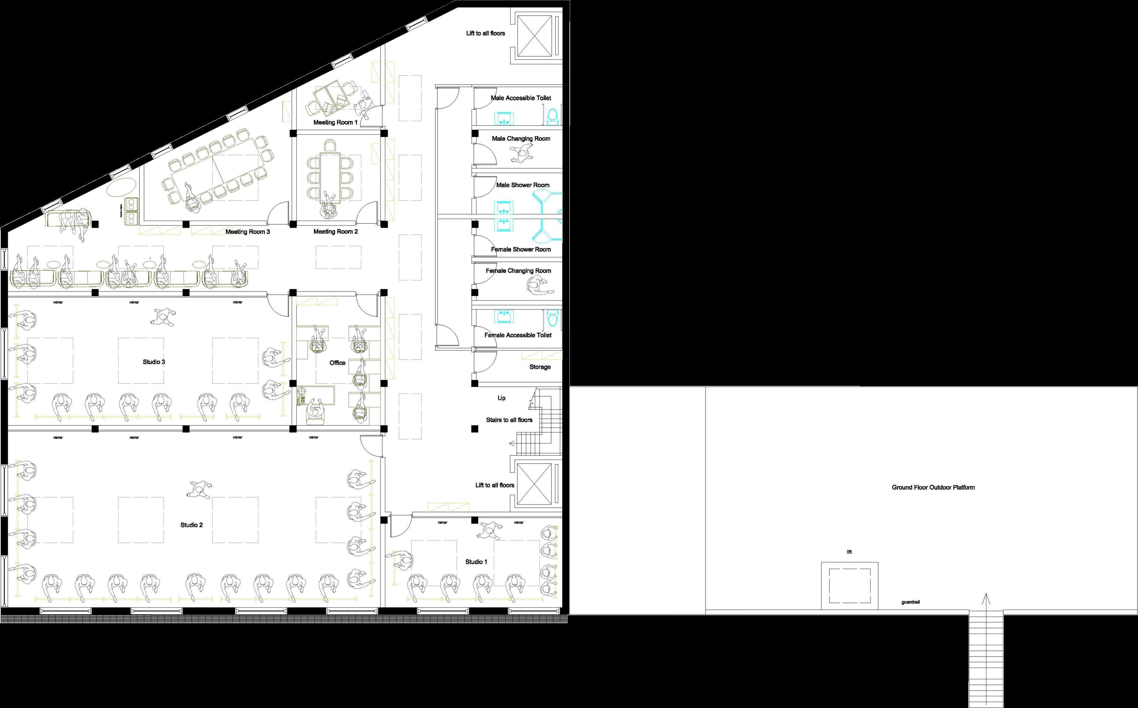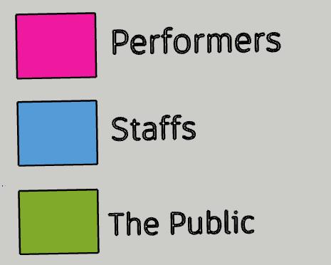 Two arrival spaces are located on second floor, which is at a turning point of ramp, and ground floor, which has supplementary lift and stairs connecting to outdoor platform; main gathering spaces are auditorium, stage, foyer, studios and meetings; observing space is cafeteria on second floor; connection spaces are backstage, bar, costume& dressing, kitchen, plant &storage, wc/change/shower etc. For circulation, there are totally two lifts at two ends of building having access to all floors, as well as a staircase to all floors too.