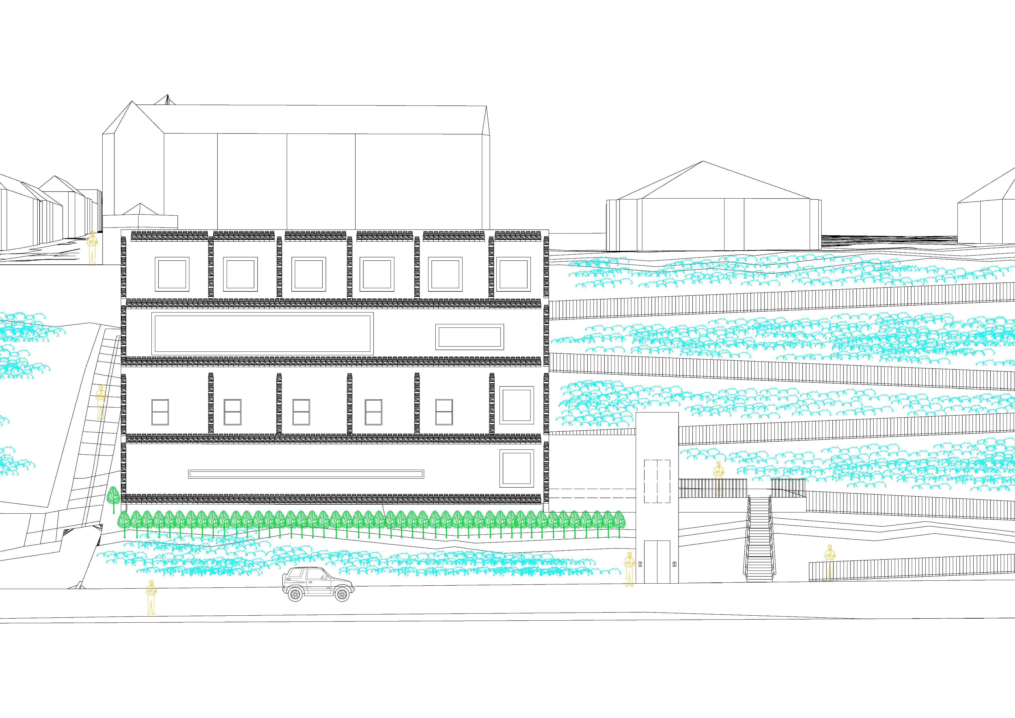 My project is called North Tyneside Performing Arts Centre. The building is located at the lower west end of the huge slope with forest. It is 25m long, 27m wide, 16.3m high, covering a total floor area of 2030㎡. It is glue-laminated-timber structured with vertical bird houses groups made by cedar attached to front elevation.