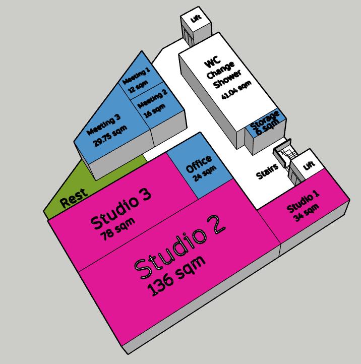 Third floor is for dance studios and workspace level with some connection places. In reality, I would like the interior to have a light and elegant colour tones compared to the strong ones for lower levels next (and last) page. Lilac paint onto timber studio wall, grass green paint for workplace wall and light grey for connection spaces.