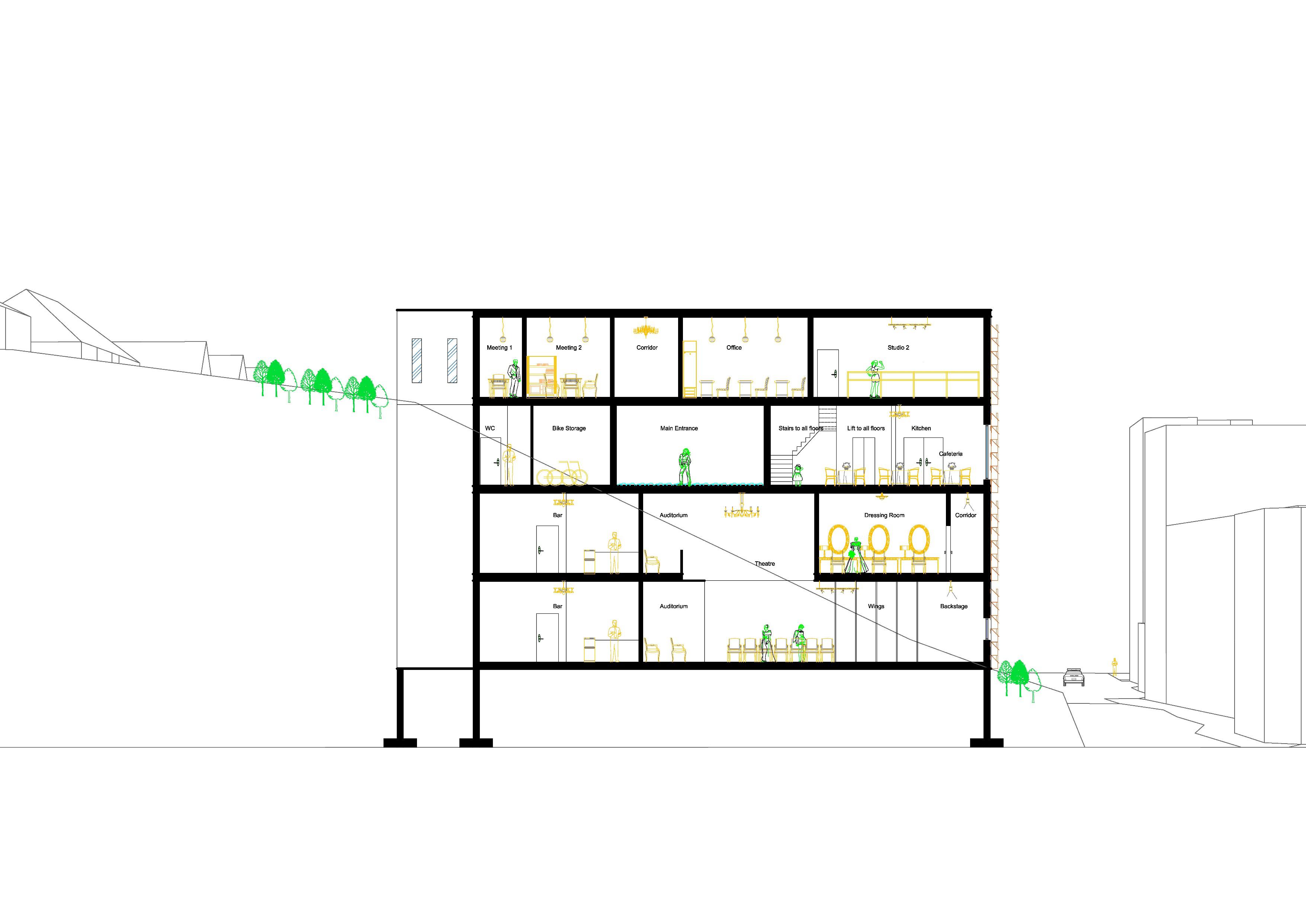 I carefully selected a cut line to cover all the key spaces. For lower levels (G&1F), it has cut the theatre, auditorium, backstage, bars and a dressing room; for higher levels(2F &3F), it has cut the main entrance and some connection or circulation space like storage and stairs, catering space, a dance studio other working spaces
