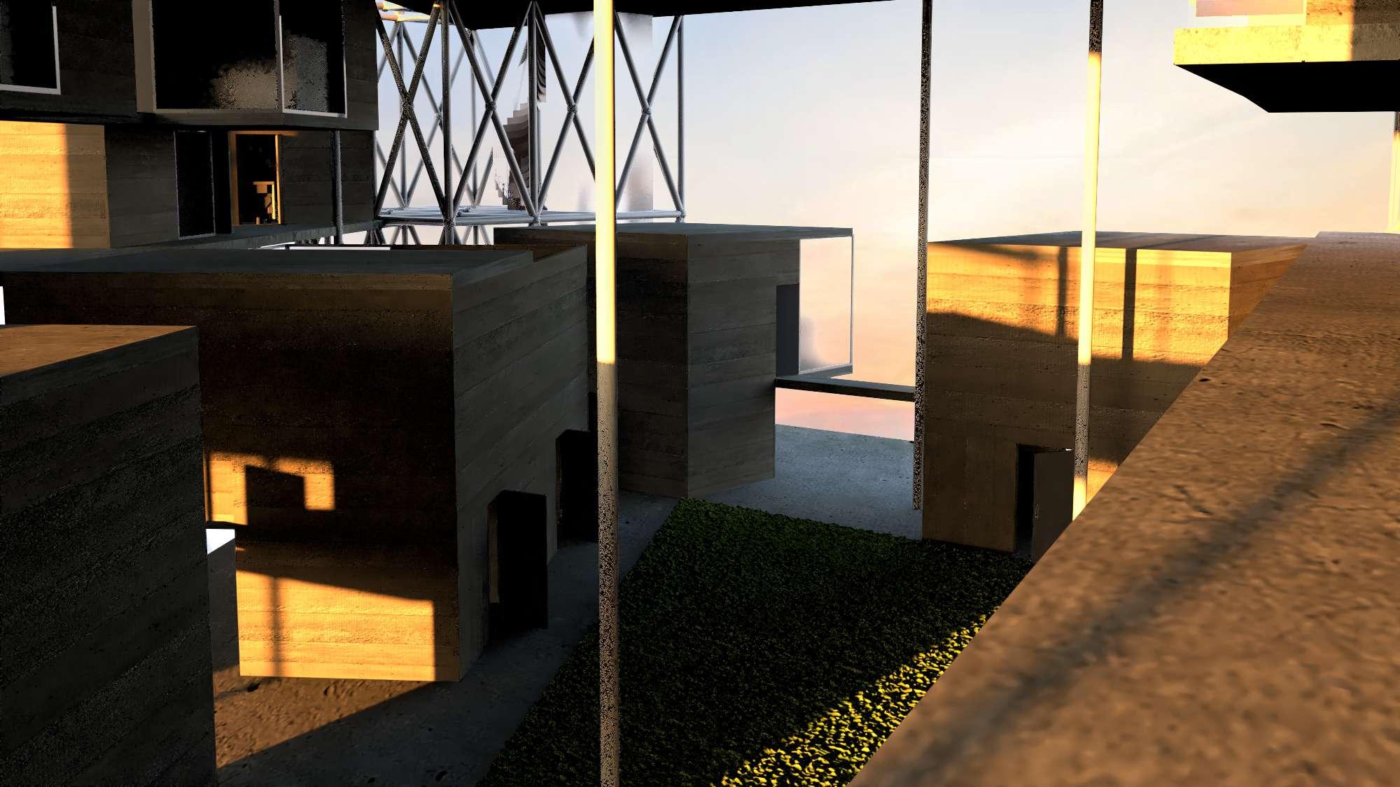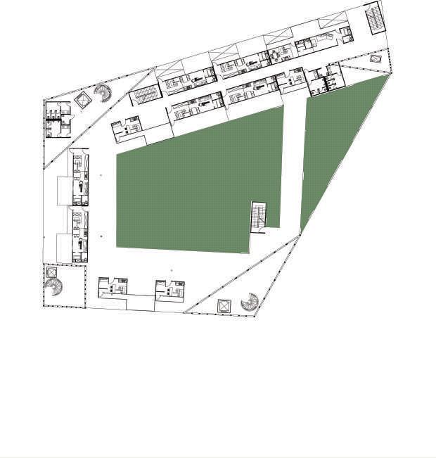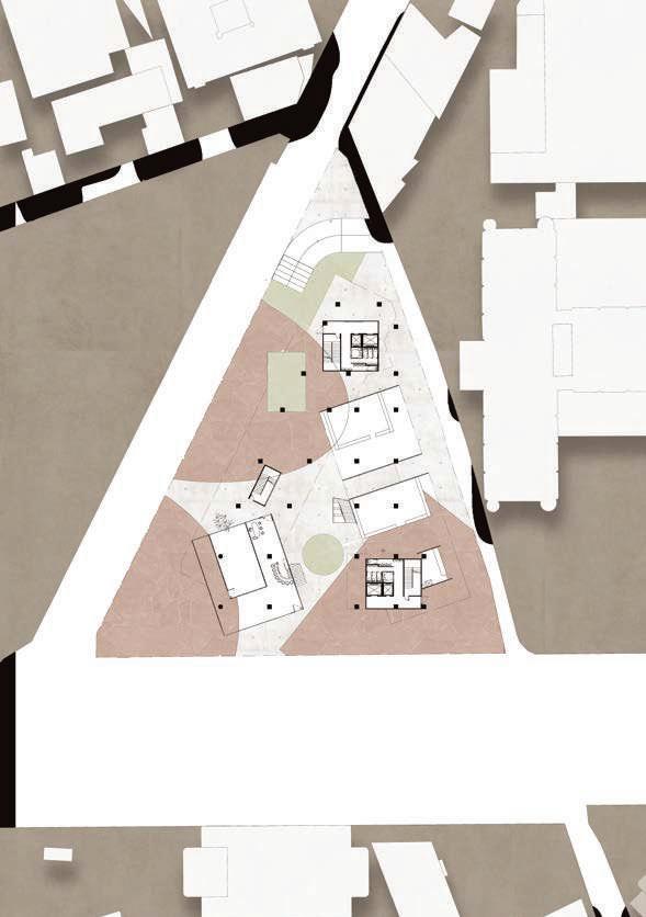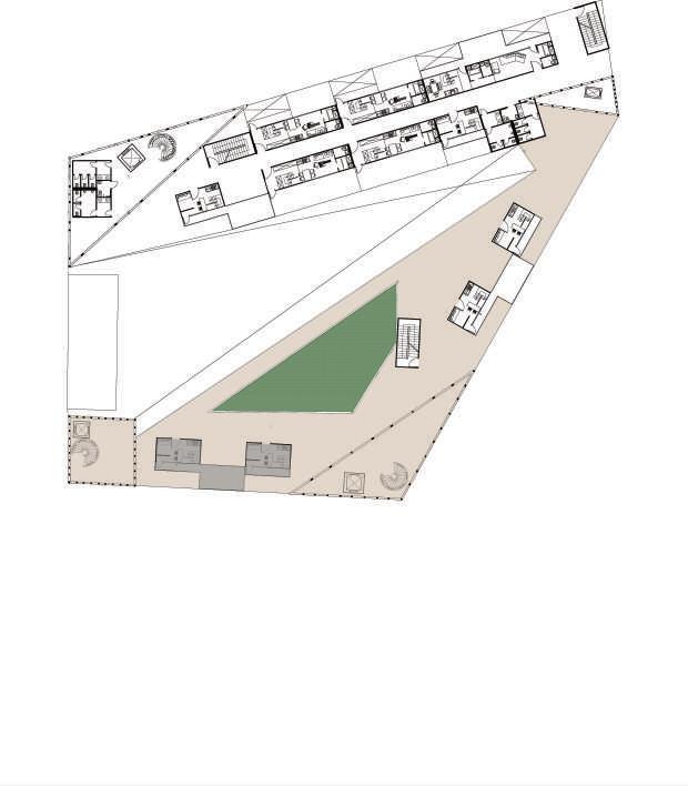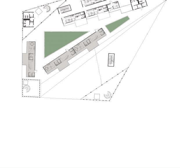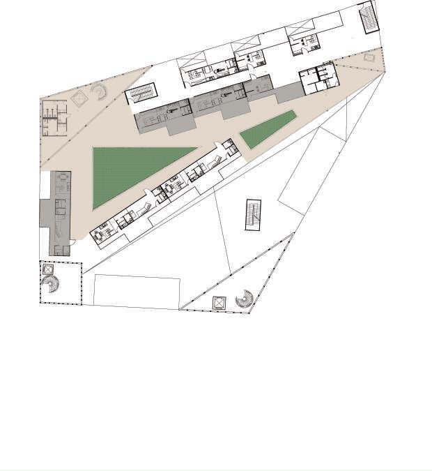 露臺,創造可供休憩停留之半戶外空間,呼應此地位於商業區及學區,岸堤及陸地之中繼休息站之