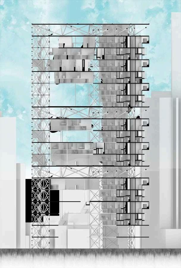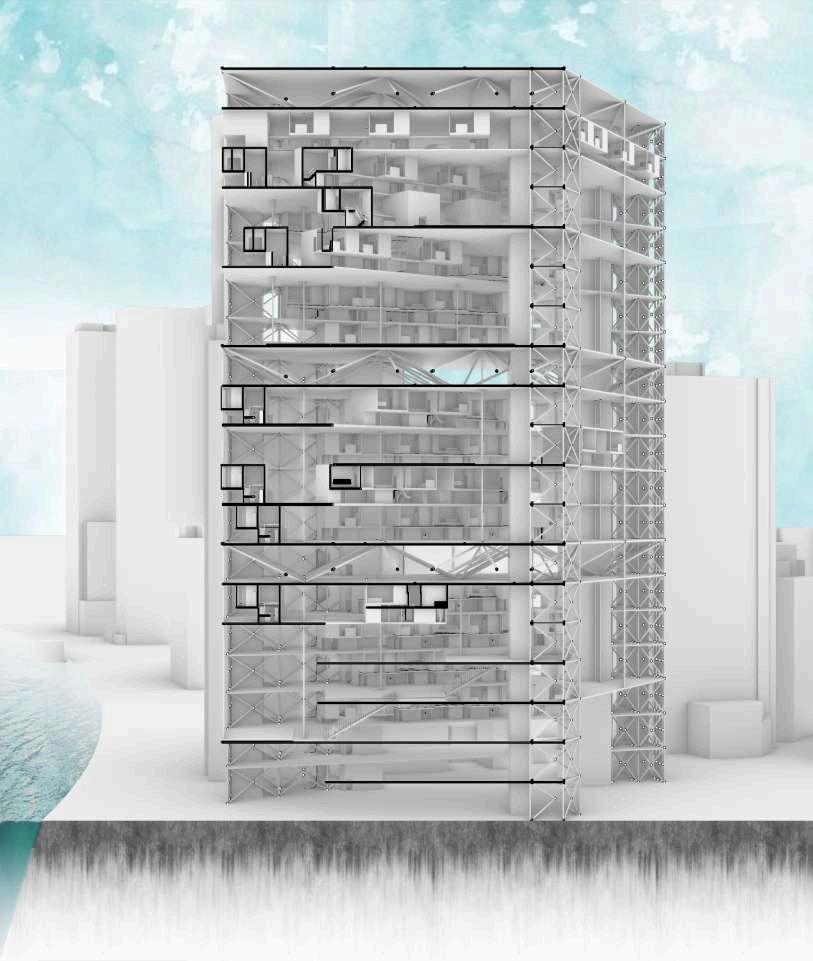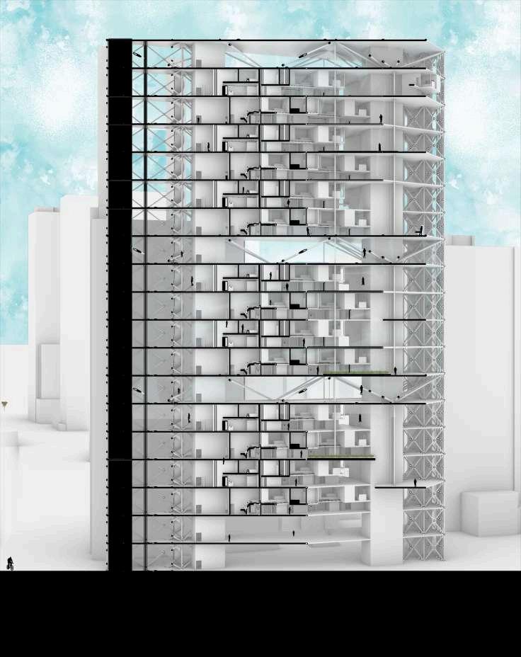 高雄市政府觀光局將於此輔導特定商家進駐作為在地品牌或觀光資訊之推廣;TDRI運用部分樓層 co-working型態之出租辦 公室作為主要經營標的,以提供青創、文創、社會企業、高雄在地社造團體等進駐使用 ,在動線中加入樓梯平台及大型 露臺,創造可供休憩停留之半戶外空間,呼應此地位於商業區及學區,岸堤及陸地之中繼休息站之