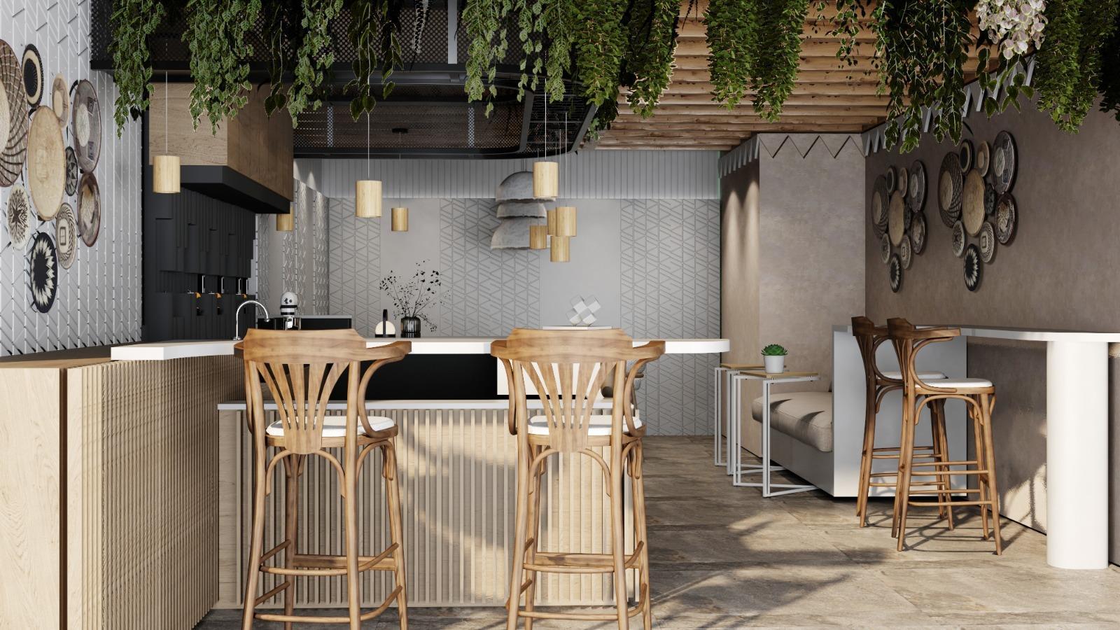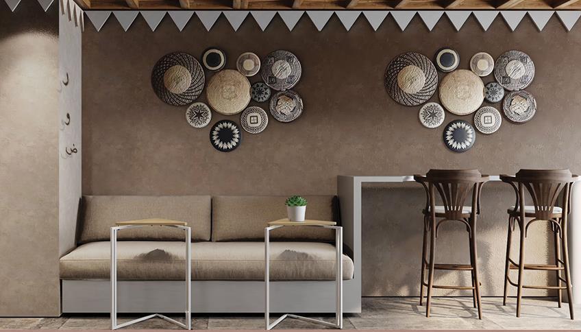 This unique coffee interior design using a modern style, inspired by the architectural elements of the Najdi building's facade which is the triangle. Also inspired from the city of riyadh city and capital of Saudi Arabia. The city's name is derived from the plural of the Arabic rawdah, meaning gardens or meadows, so named for a natural fertility provided by its location.