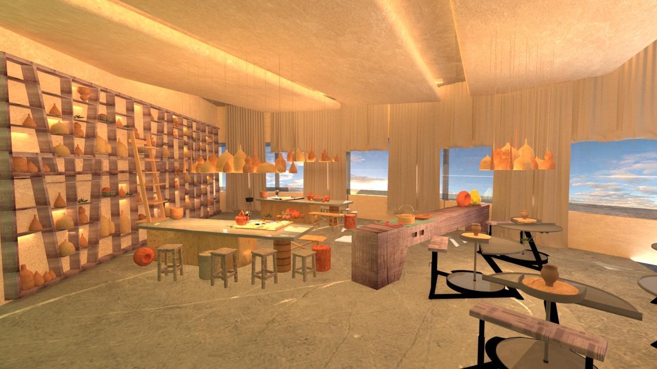 Taking inspiration from the fortresses in Saudi Arabia of the urban fabric of old city, then implemented the local tent in a modern way. Immersed by surrounding, extended from earth, connected to the environment and framed by sky. Using neutral colours along with the construction materials that was used mud and plaster, triangles, squares and circles.