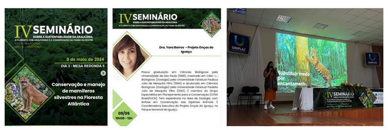 InMay,weparticipatedintheIVSeminaronthe SustainabilityofAraucariainLages(SC).Wetook partintheRoundTable:Conservationand ManagementofWildMammalsintheAtlantic Forest,presentingtheworkoftheProjectJaguars ofIguaçuandalsogivingalectureon communicationforconservation.