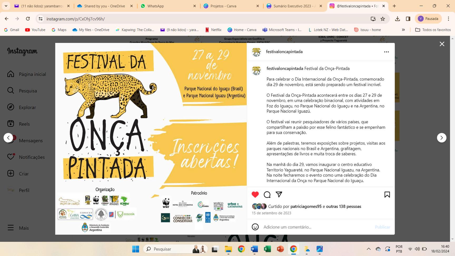 To celebrate International Jaguar Day (November 29), the Jaguar Festival was held from November 27 to 29, with activities at both IguaçuNationalPark(Brazil)andIguazúNationalPark(Argentina). Thefestivalbroughttogetherresearchersandprojectsfromvarious countries working on jaguar conservation, along with NGOs and governmentrepresentativesfromBrazilandArgentina.