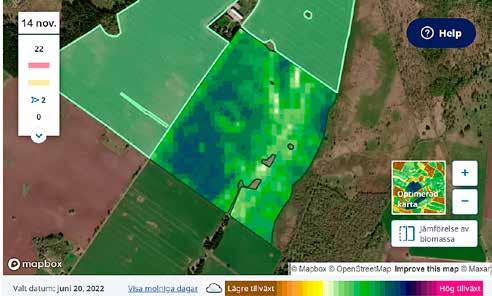 Jämnare tillväxt Kartorna och styrfilerna förbereds i Atfarm som baseras på satellitbilder från hösten. Sedan flyttas filerna över till John Deere traktorn. I de fält där givan spreds med tilldelningsfil i första givan kunde man se på satellitbilderna att till växten var jämnare under säsongen. – Min kollega Melker Olofsson, som har gjort majoriteten av arbetet i fält, beskriver Atfarm som väldigt användar vänligt och jag håller med även om jag själv bara fick en introduktion, rappor terar Gustav.