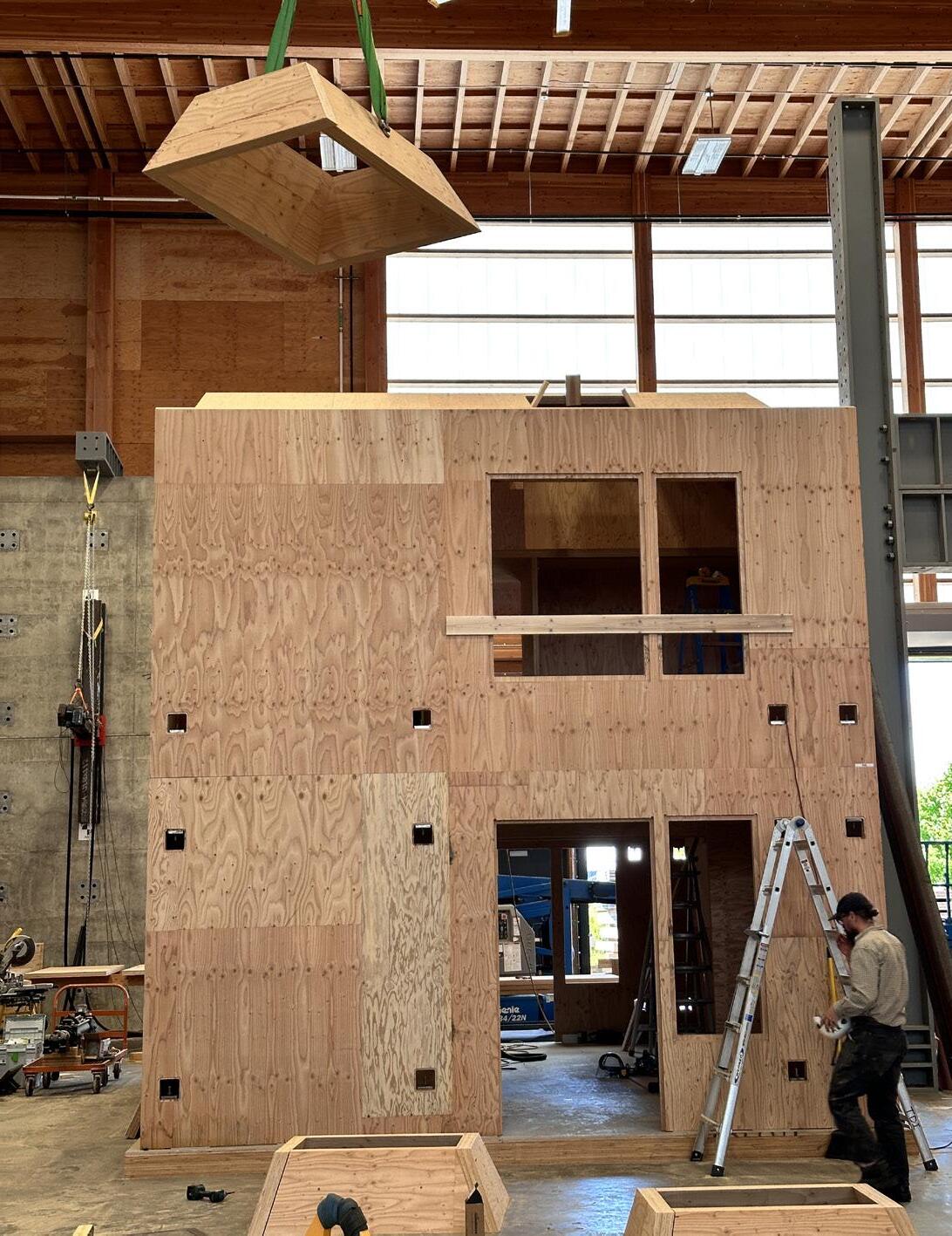 The house is constructed entirely from prefabricated mass plywood panels, with 3” panels for the exterior walls, floors, and roof, and 2” panels for the interior walls, fastened together using steel plates. The first prototype, fabricated and constructed in the Emmerson Lab using CNC technology, was built by a team of UO faculty, graduate students, and lab staff. Following lessons learned from this initial model, a second prototype will be built on a concrete pad in the Emmerson Lab yard, fully insulated and clad for testing constructability and labor costs. Structural, thermal, and acoustic testing will be performed on the second prototype to evaluate performance.