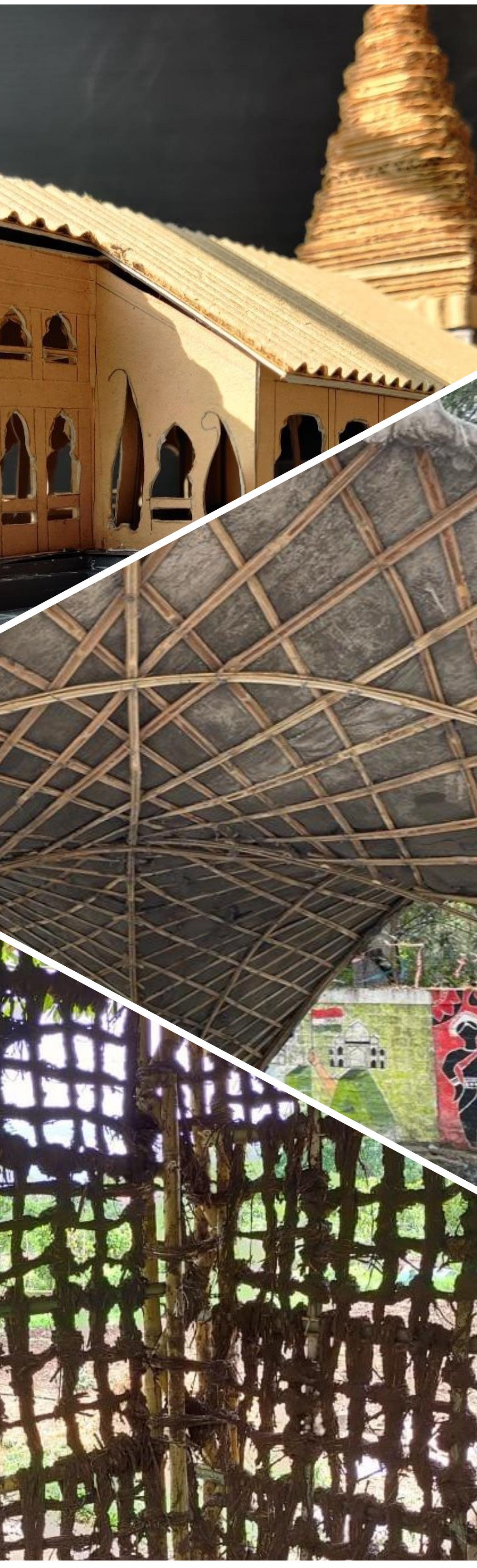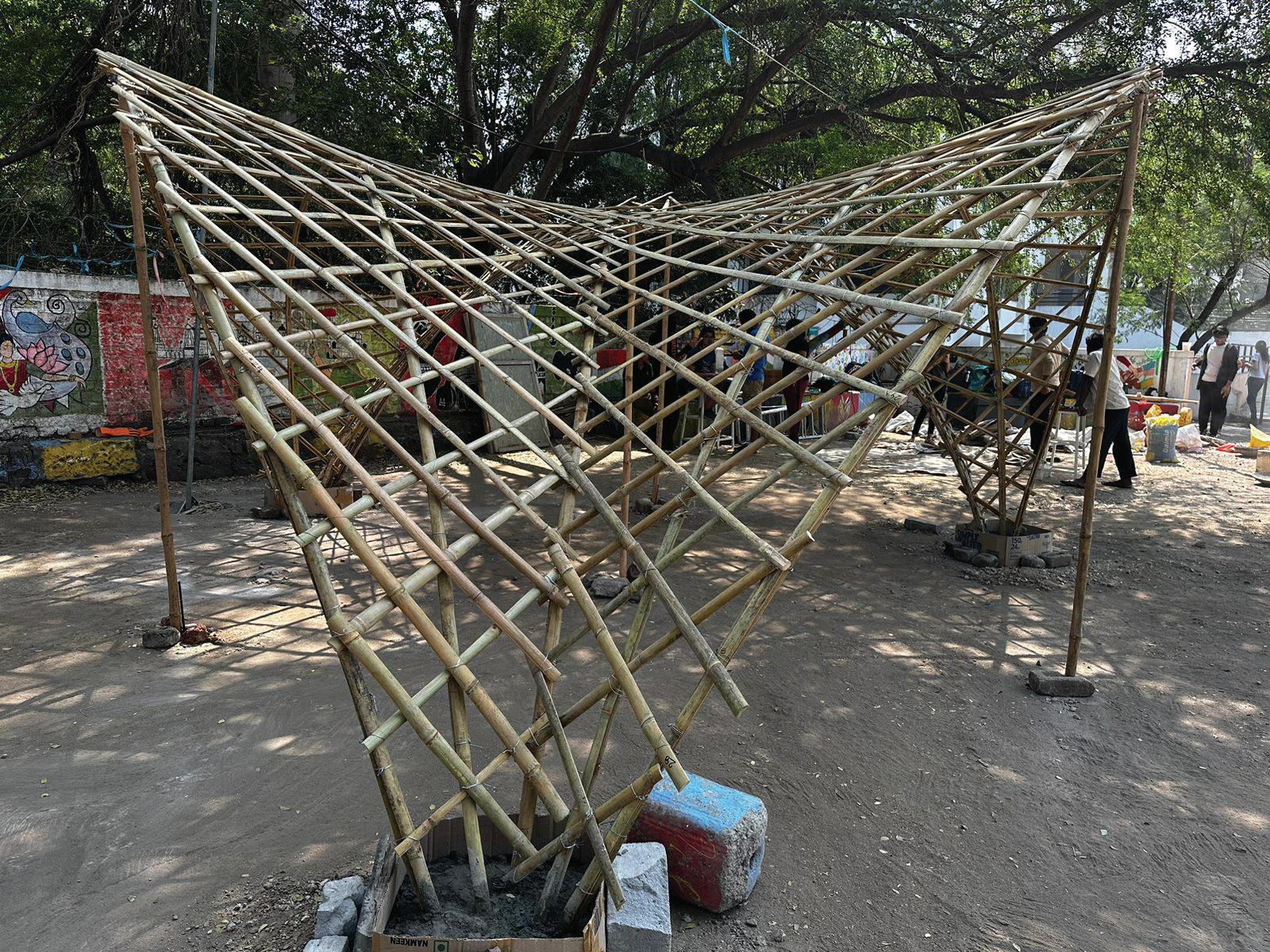 The workshop was conducted by Ar. Vaibhavi Agrawal and Ar. Shital Chaudhari and their team from Ray Studio in January, 2023. We started explorations on scale models using thin sections of bamboo. Then each initial task of construction was divided in teams - Excavation, Marking, Framing, Joining. Then we tied every joint and jute bags coated with concrete over the structure with wire ties. Later gaps were individually filled with concrete. Curing was done for a week after the construction. The pavillion is built in the campus of MMCOA, Pune.