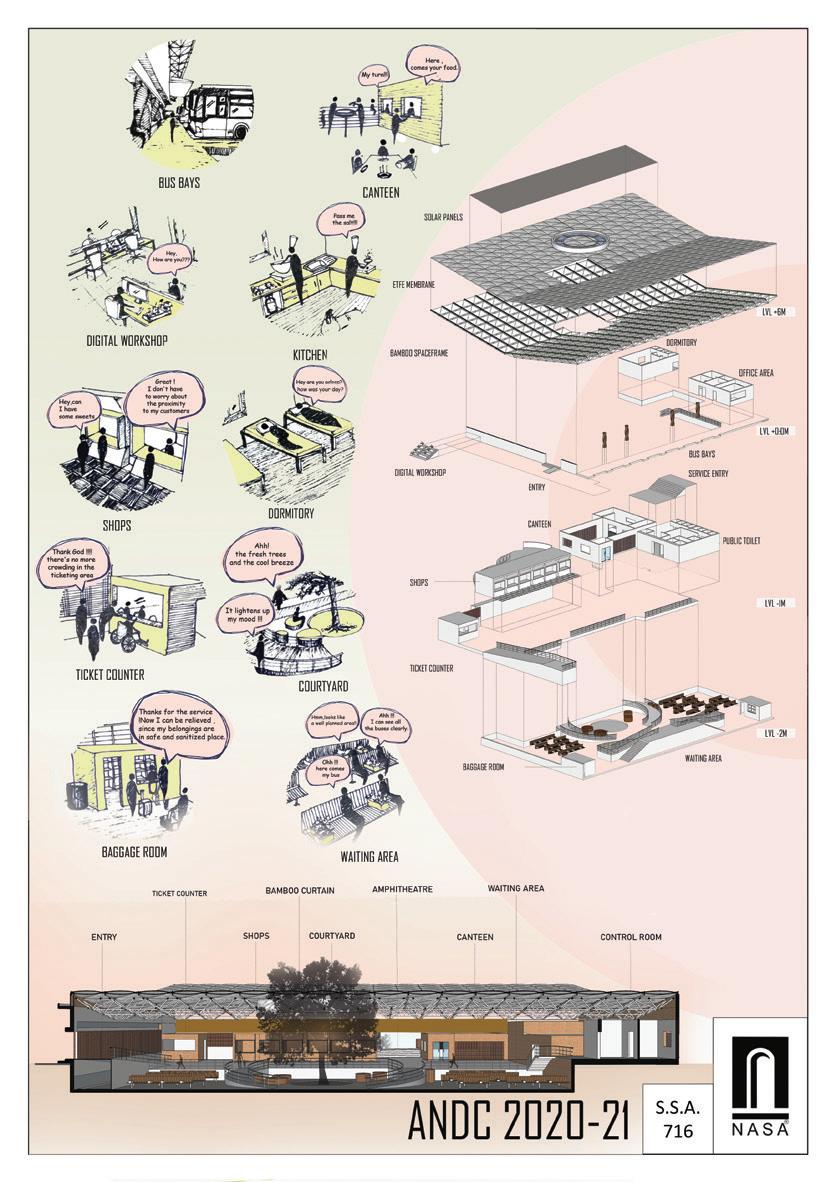The brief asked us to redesign a basic space such as a bus terminus which has huge implications in scenarios such as the Covid-19 situation. Unlike the previous bus stand, our design that has a user friendly open and safe atmosphere, liberates the people from fear and isolation. We are breaking the barrier of normal bus stand by introduction of public library, digital workshop and using scrap buses as shops which inturn lifts economy at small level at our site in Nandura.