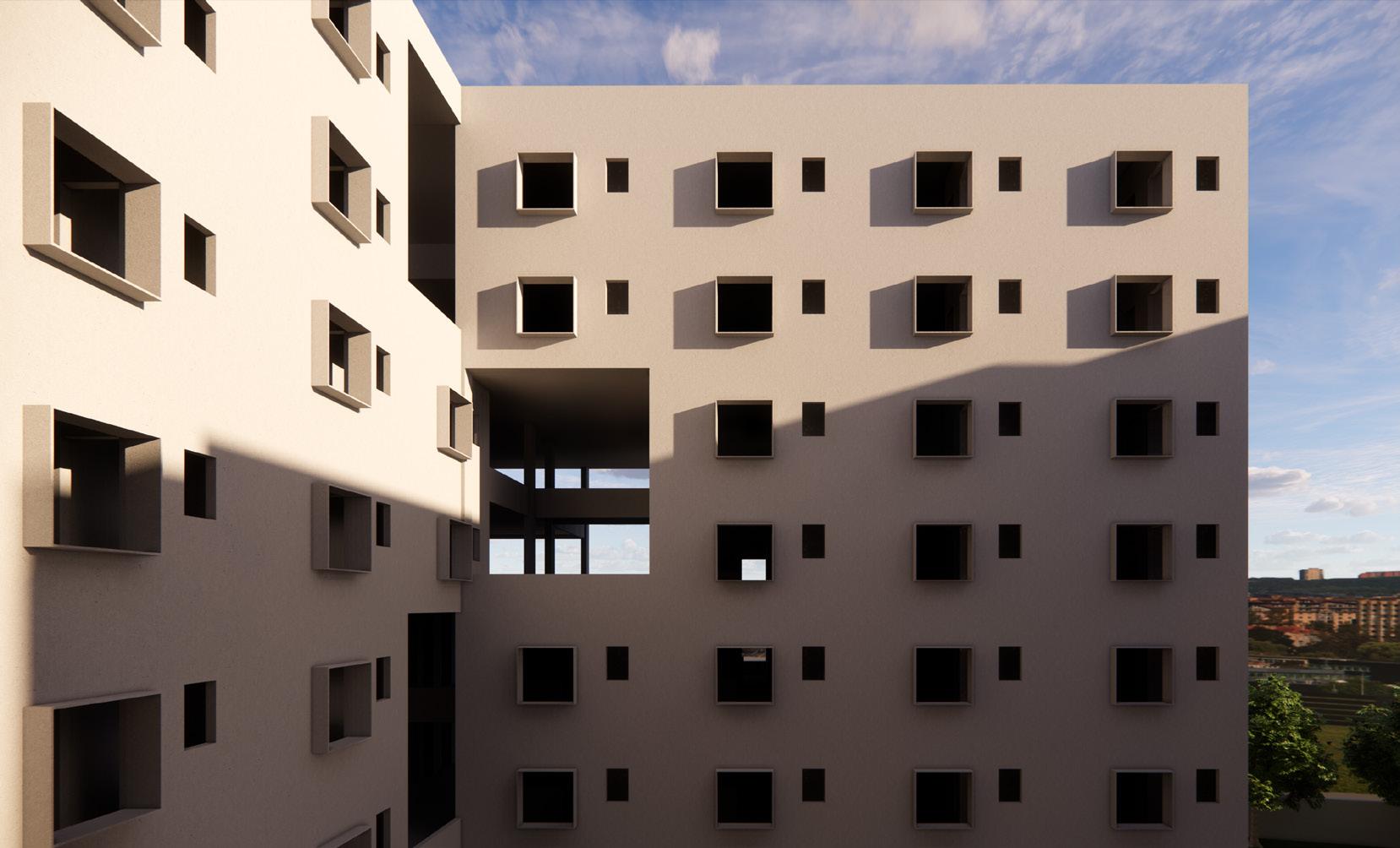 Voids in elevation also act as interactive spaces as well as break the weight of the building