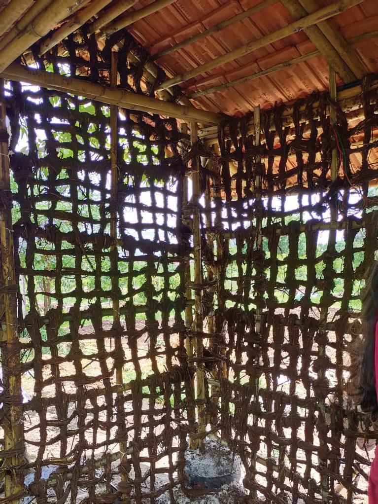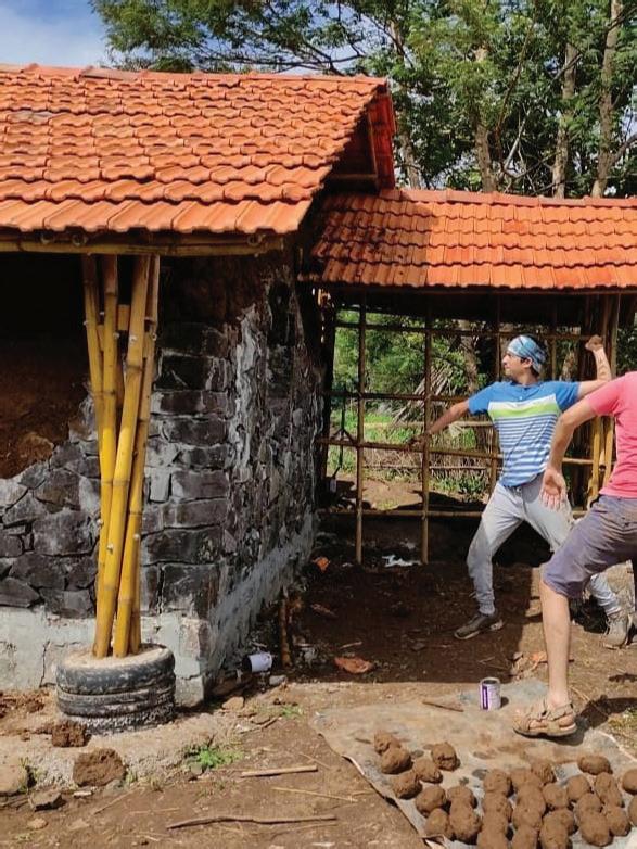 Me along with my colleagues, in June 2021, volunteered to help in the construction of a mudhouse for the caretakers of a farmhouse at NDA Road, Pune owned by Mrs. Arti Kirloskar. This project was taken up by Ar. Amruta Naidu and Mr. Prasad Thete of the Urvee Public Trust and was guided by Ar. Satyendra Bhagat. The technique adopted was wattle and cob. We tied paddy straw treated with lime and then coated in clay to the bamboo framework. This act as the reinforcement for the mud layer coming over it and reduced the total amount of soil required. After drying up the ties look like ‘Bombil’ fish kept for drying, hence it was termed as the bombil technique. Cob balls were put over the reinforcements to create a 9inch thick wall. It developed cracks after drying which were filled periodically and then a lime plaster was applied to give a finish. The windows and doors were made by the students at Hunnarshala Foundation.