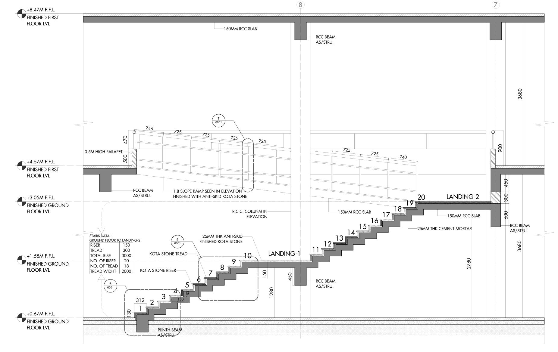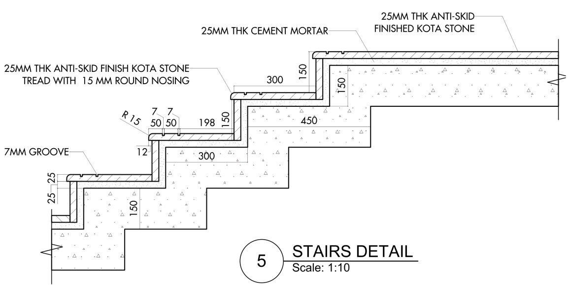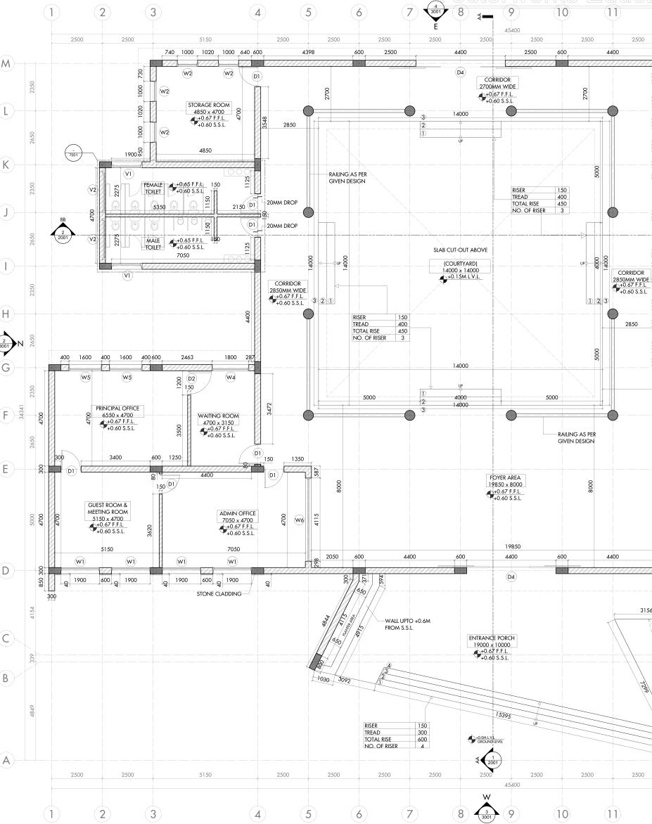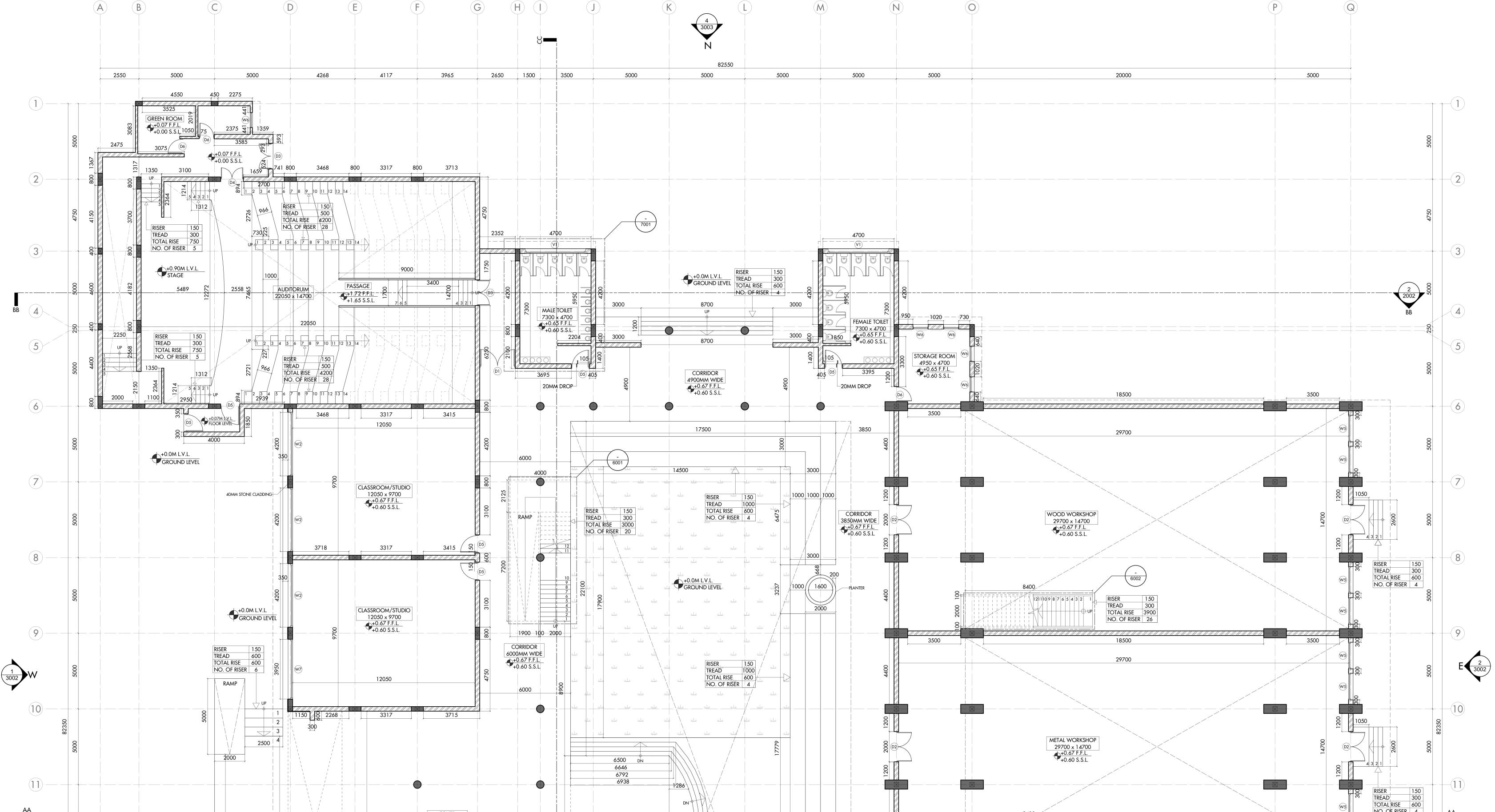 It covers layout plans with accurate dimensions, material specications, structural systems, wall sections, door-window schedules, and joinery details. Special attention is given to site-sensitive elements like tree preservation, natural ventilation, and integration of open and built spaces.