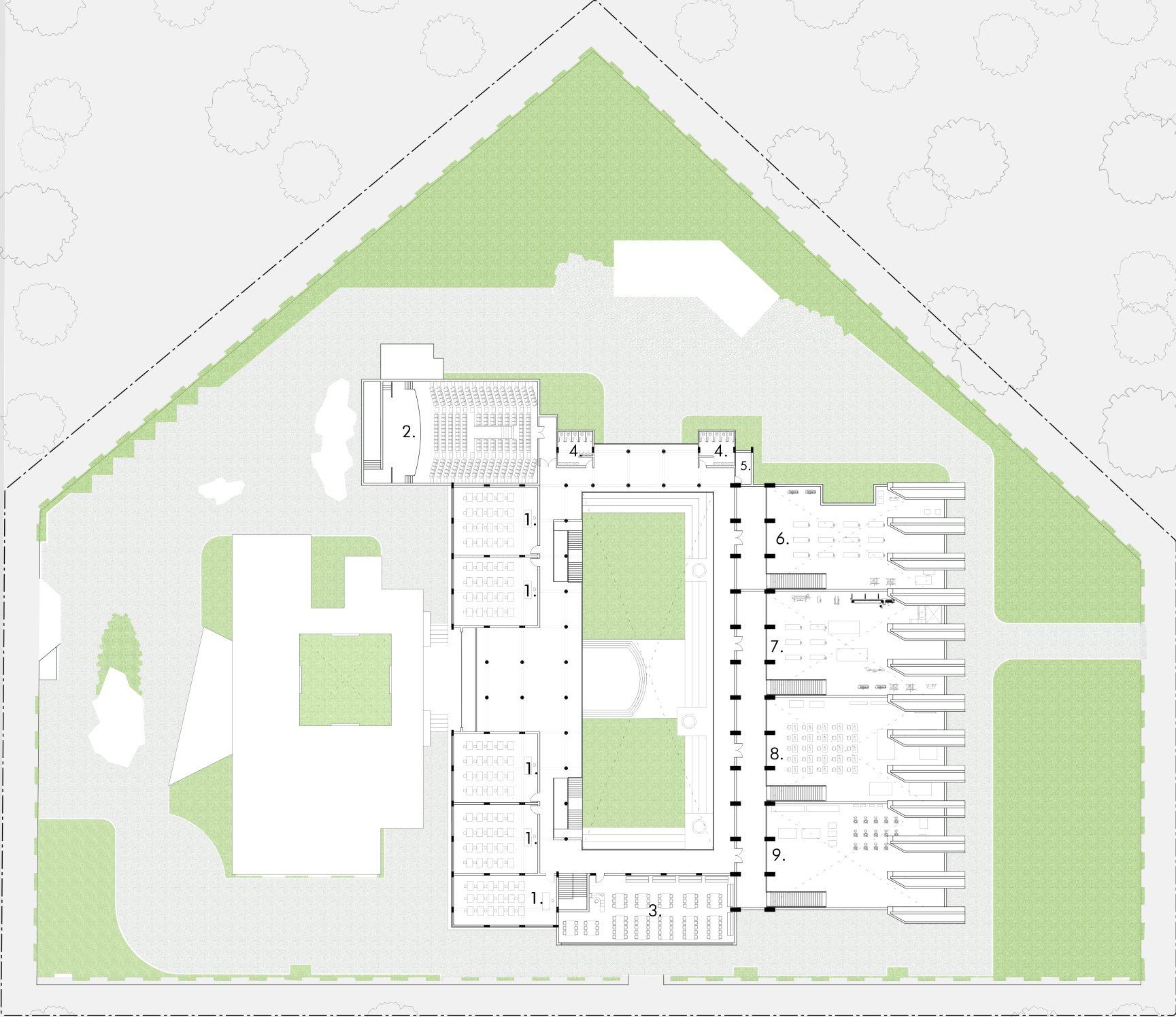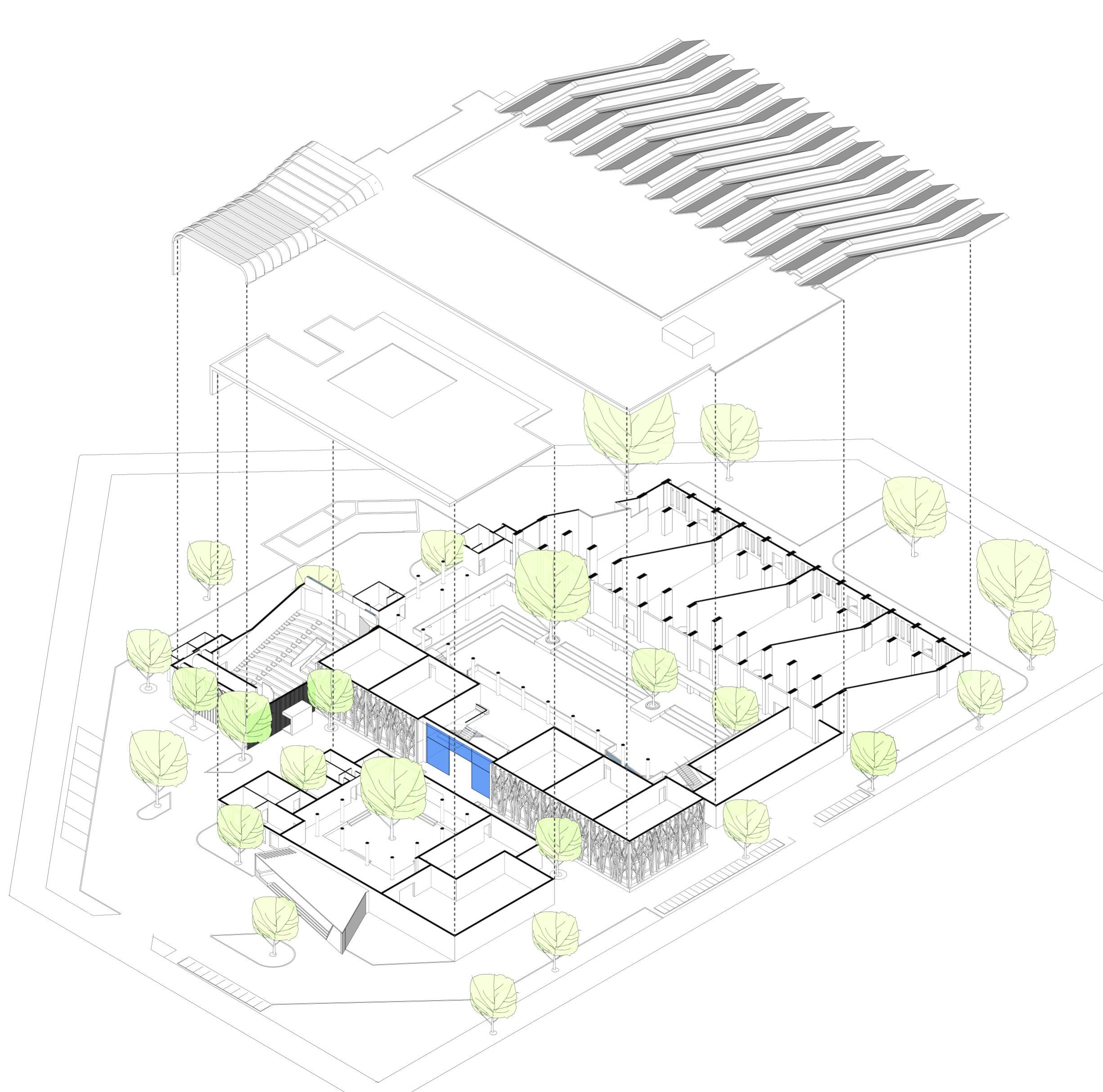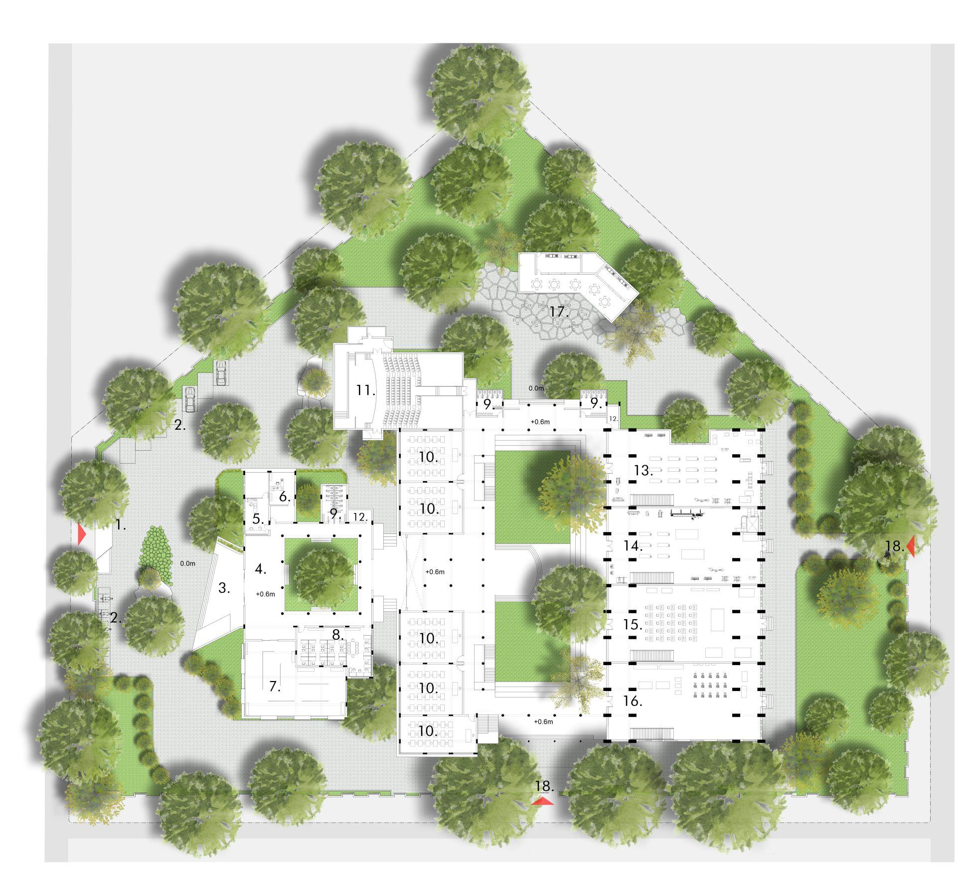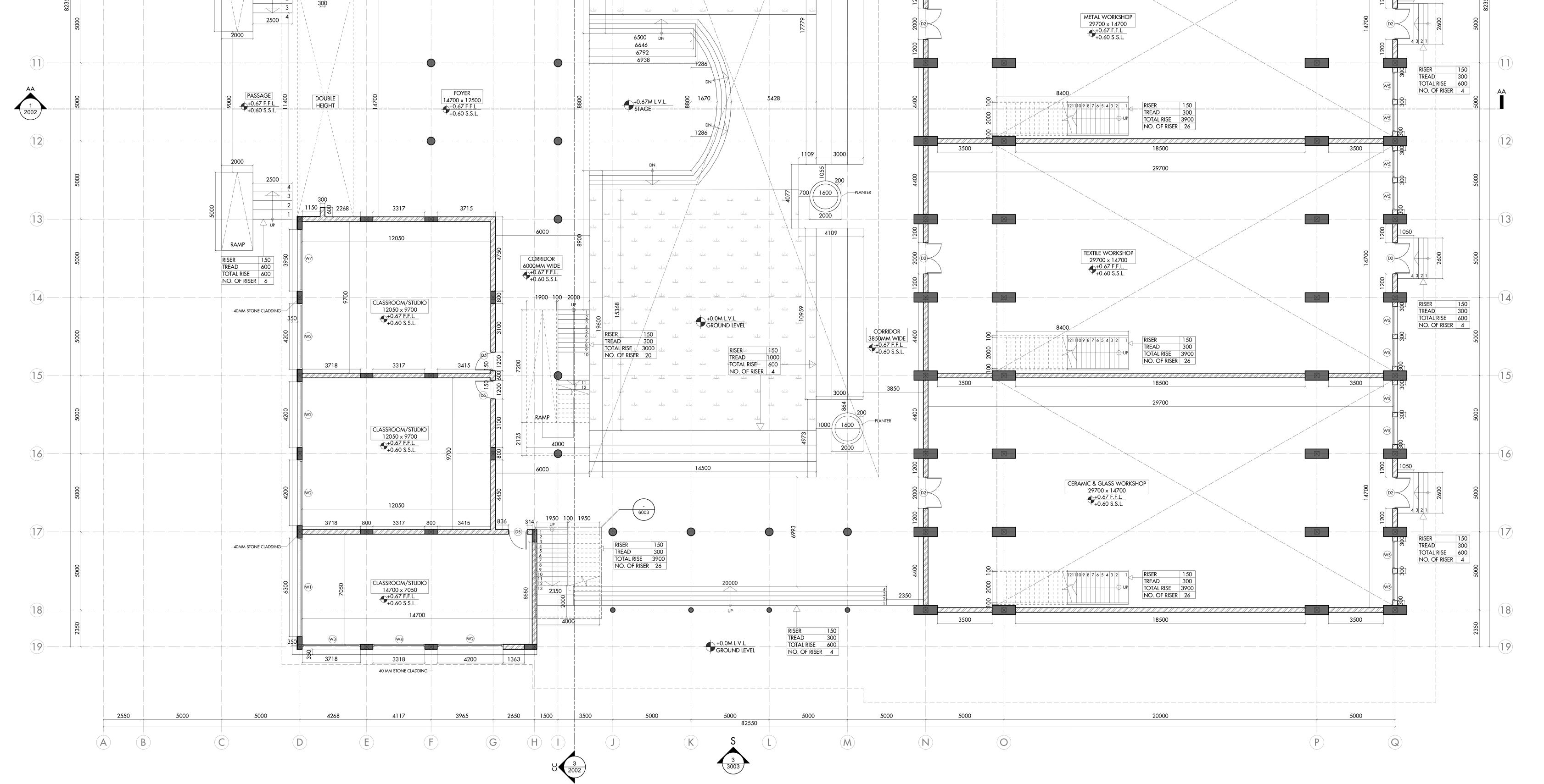 Key facilities include administrative ofces, studios, workshops, a library, an auditorium, and recreational areas. Emphasis is placed on visual connectivity and micro-climatic considerations, creating a dynamic learning environment that fosters creativity and sustainability in education.