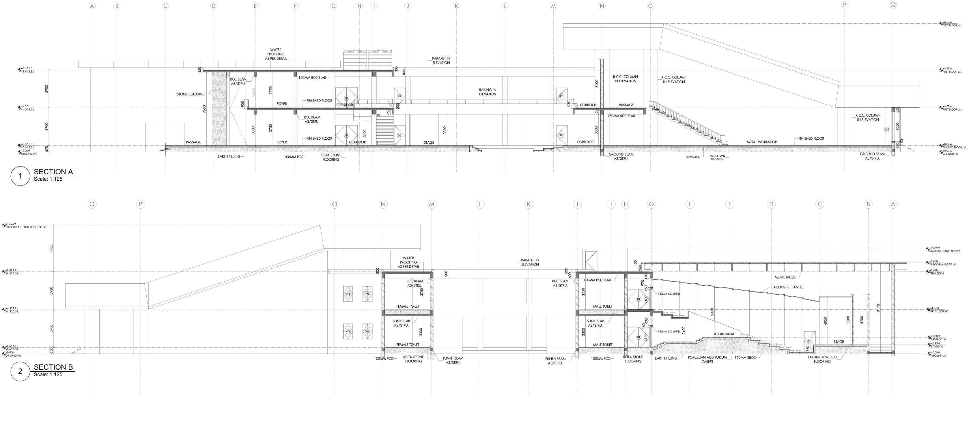 The working drawing set for the Design Institute at IISc Bangalore includes detailed architectural plans, sections, elevations, and construction details necessary for on-site execution.
