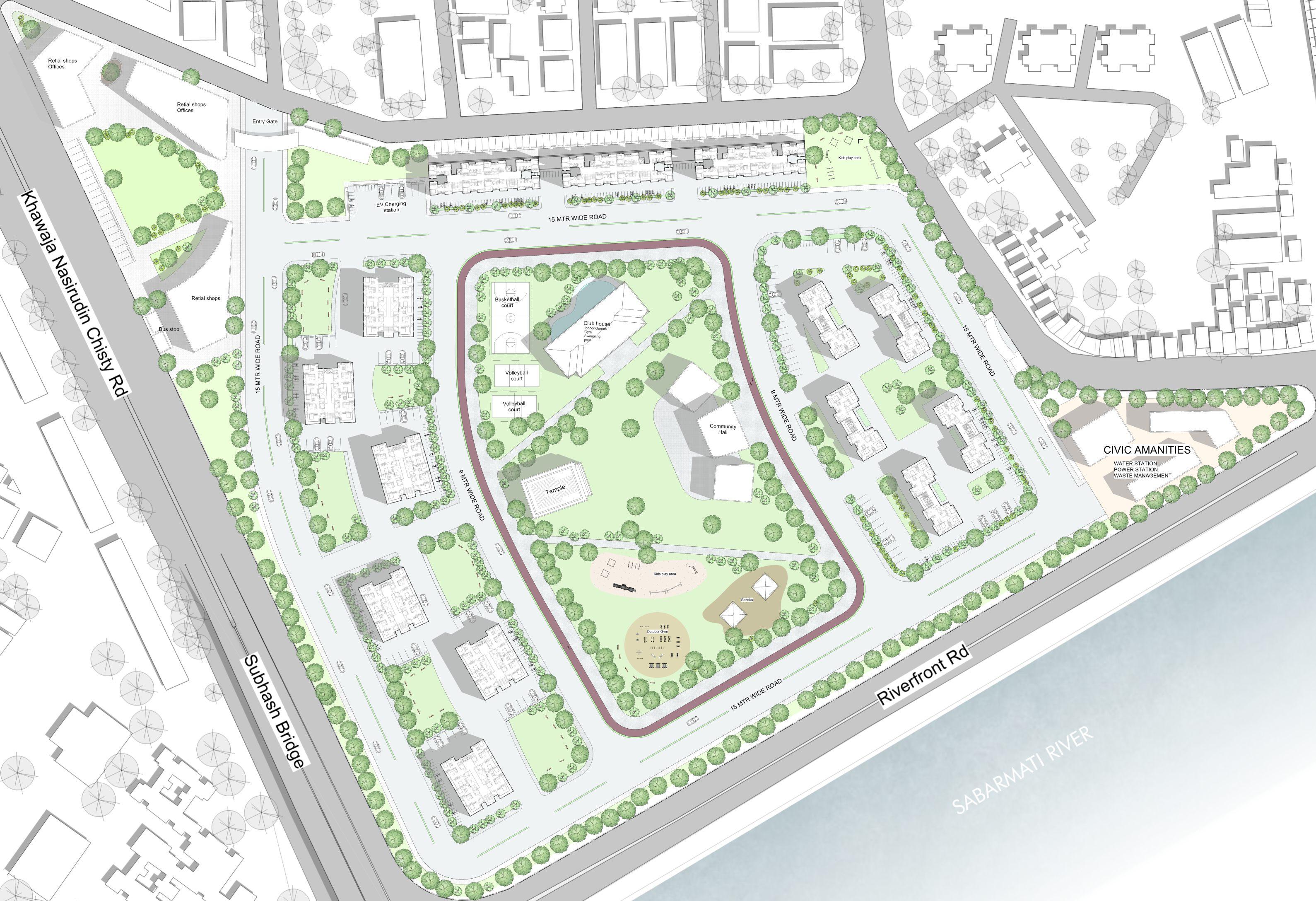 The Riverfront Housing project in Ahmedabad is designed to be a high-density, mixed-use development that offers a blend of LIG and MIG housing, along with commercial spaces.