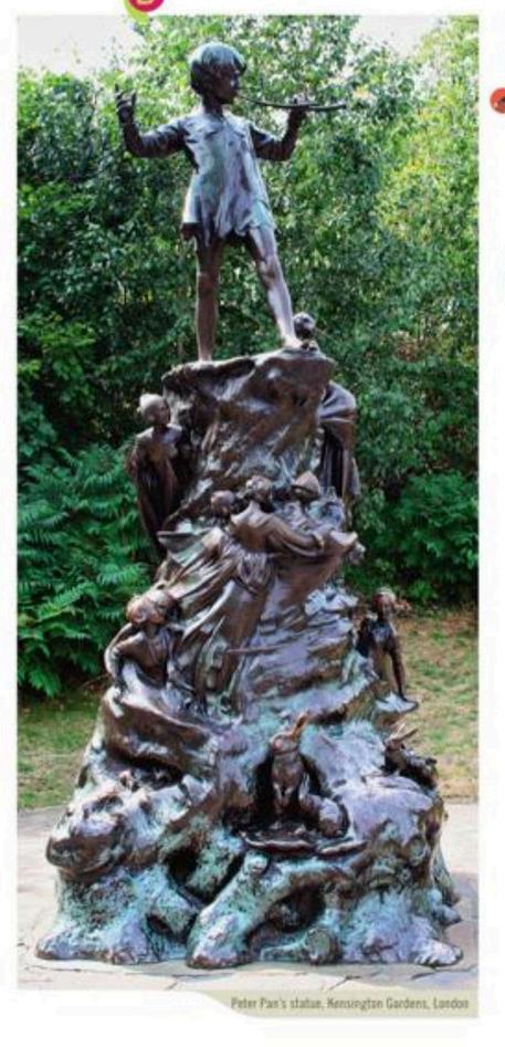 The statue of Peter Pan expresses exploration and adventure through both its design and the story it represents. Peter Pan stands at the top of a rocky base, playing his flute, which gives the sense that he is calling others to join him on a new journey. His pose is confident and open, showing a character who is always ready to move forward and discover new places Around the base, the small figures of fairies, children, and animals create a lively scene that reflects the magical world of Neverland, a place built on imagination, freedom, and constant discovery. The rising shape of the sculpture, with characters climbing and interacting with the environment, suggests movement and the excitement of entering unknown spaces.