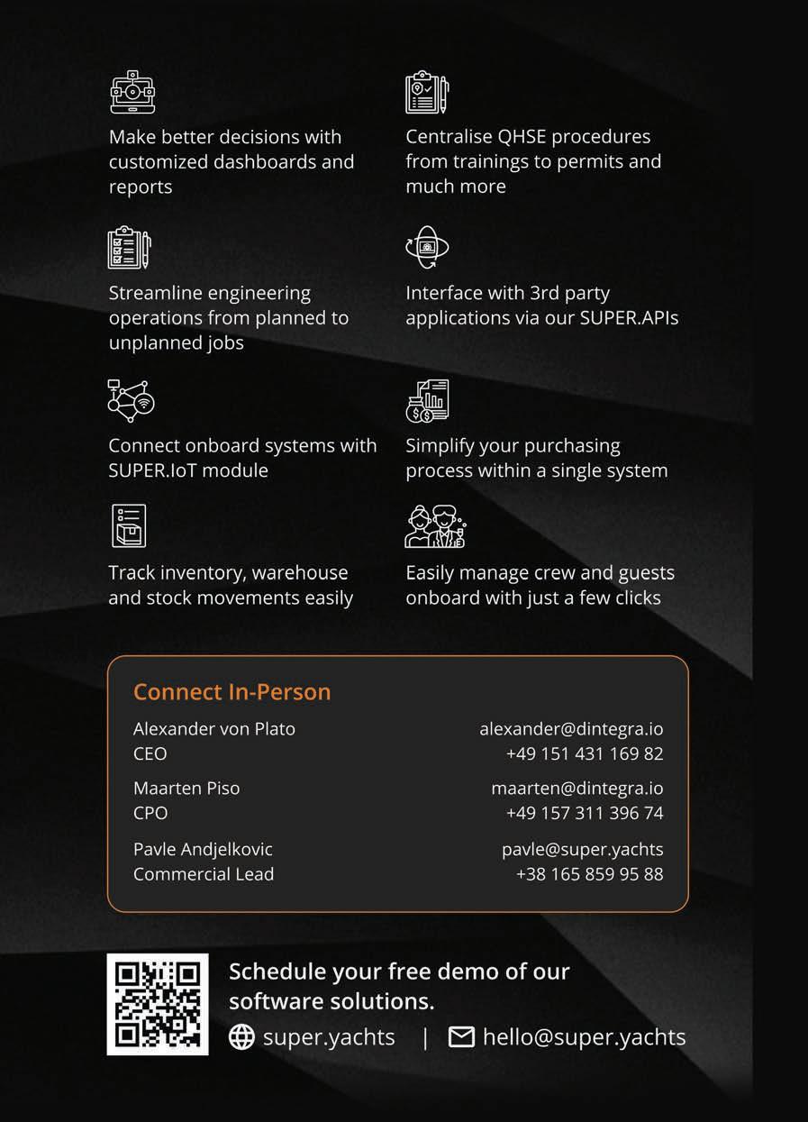 The captain’s role will blend human expertise with AI and automation. While yachts may be semi-autonomous or even fully self-operating, captains will still oversee systems, monitor AIdriven navigation, and intervene when needed. They’ll be more like “captains of the ship’s mind,” managing tech systems and ensuring the yacht operates at peak efficiency.