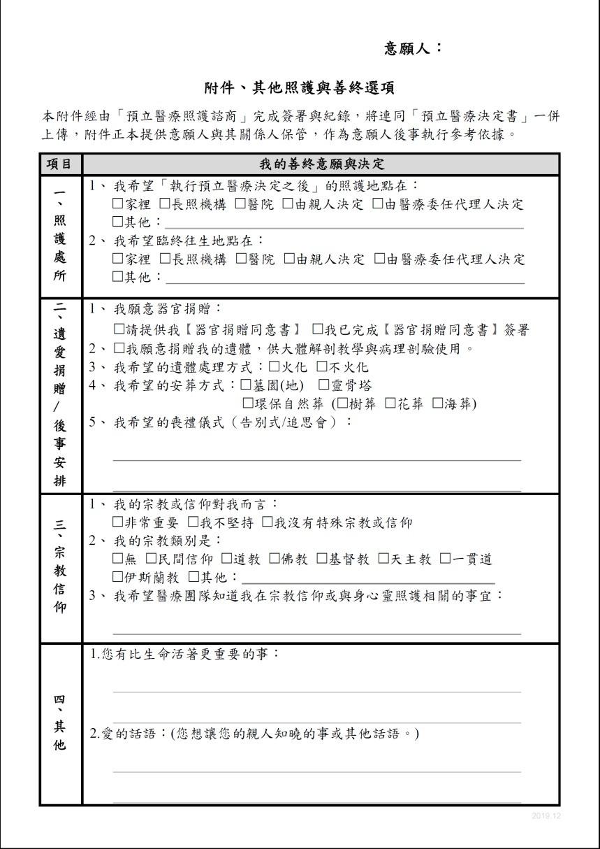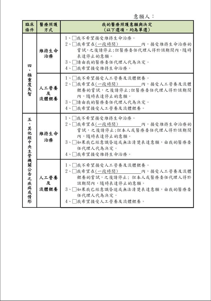 2 預 ⽴ 療 宣 ⾔ 我的 終我 定 ⽣ ⼤事先 ⽇ 期 變 更 項 ⽬ 我是 我的⽣⽇ 年 ⽉ ⽇ 預⽴ 療 ⽇期 年 ⽉ ⽇ 參 友 構單位 台 慈濟 院預⽴ 療照 團隊 預⽴ 療 定書上傳⽇期 年 ⽉ ⽇ 預⽴ 療 定書變更 台 慈濟 院預⽴ 療照 團隊專線 02-66289779轉8608 □ □ □ □ □ □ □ □ □ □ □ □ 年 ⽉ ⽇ 年 ⽉ ⽇ 年 ⽉ ⽇ 年 ⽉ ⽇ 年 ⽉ ⽇ 年 ⽉ ⽇ 療 置 療 置 療 置 療 置 療 置 療 置 療 代理⼈ 療 代理⼈ 療 代理⼈ 療 代理⼈ 療 代理⼈ 療 代理⼈