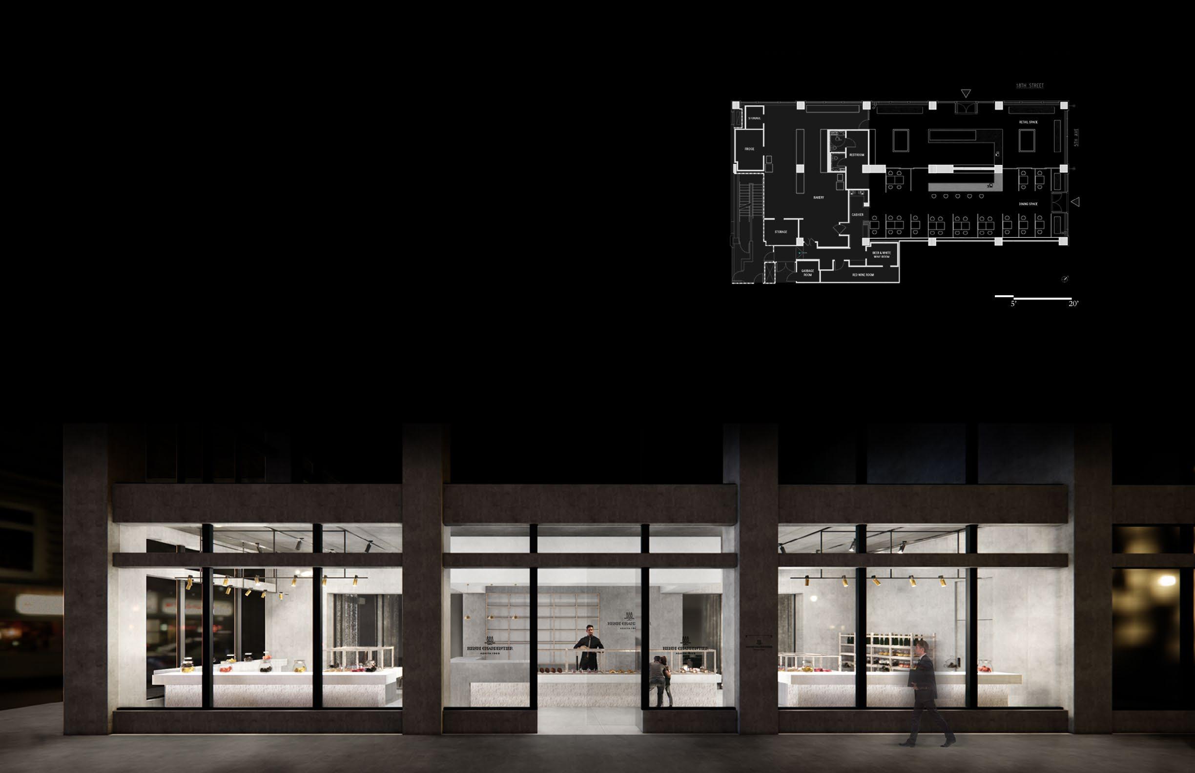 This project is to design a food space for the dessert brand HENRI CHARPENTIER. The site is located at 126 5th Ave, Manhattan. The proposal is for a type of composite-space that merges a sophisticated afternoon or evening dessert and bar destination, with a more casual retail space selling various artisanal sweets and desserts. The design also addresses the new paradigm we are presently living in: a viral pandemic - create spaces where people can see others, hear others, but not come in contact with them directly.