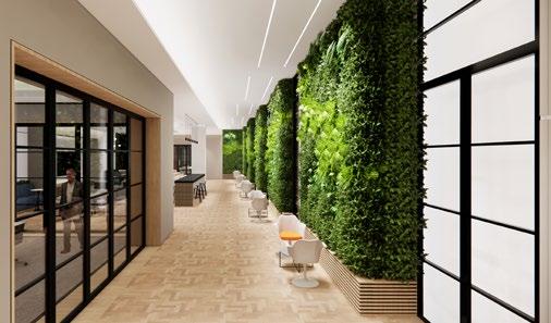 The design is intended to create an inviting and functional space that enhances the after-work life of the staff in the office building. The step-shaped moss wall is a particularly unique feature that adds an element of visual interest and dynamism to the space, helping to create a vibrant and engaging atmosphere.