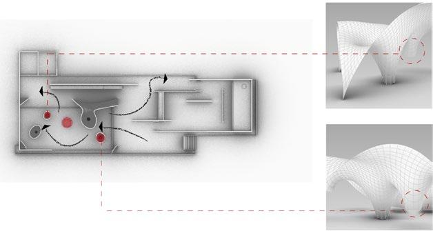 Tiles are assigned based on the “planarity” of the pavilion. Thus tiles in vertical and horizontal directions have different tiles and show a transition from flat to steep. The shadow of the tiling becomes a translation of the structure and direction of the forces above, changing based on the time of the day. Aluminum sheet is selected as the material because of its ductility, reflectivity, strength, and ability to provide shades.