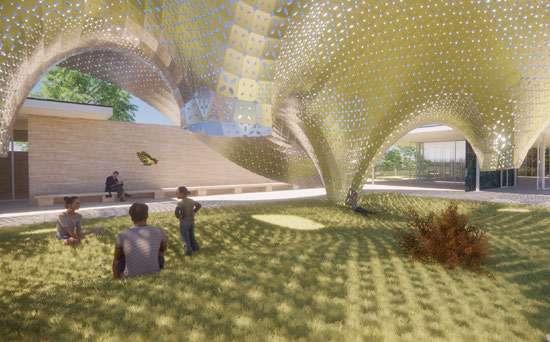 Tiles are assigned based on the “planarity” of the pavilion. Thus tiles in vertical and horizontal directions have different tiles and show a transition from flat to steep. The shadow of the tiling becomes a translation of the structure and direction of the forces above, changing based on the time of the day. Aluminum sheet is selected as the material because of its ductility, reflectivity, strength, and ability to provide shades.