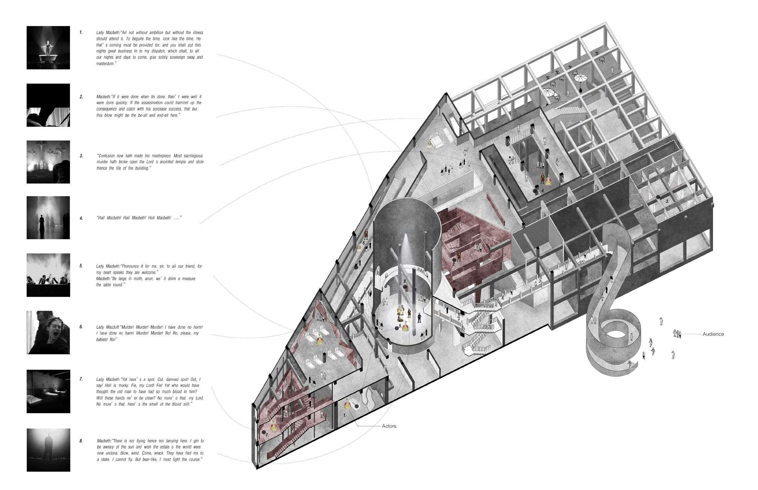 The project is a renovation of the Mantuan paper factory and the idea of the renovation starts from exploring correspondence between drama scene and space. Dramatic conflict produces spatial perception. And the narrative order of space is in connection with the development of the drama. A new type of theatre called "Immersive Theatre" is built up to create experiences where audience members give up their "observer" status to become co-actors and co-creators of the narrative and of the storytelling process. And the audience will have an emotional resonance from the architecture.