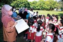 Encik Zulkhairi (left) officiating the event. Also in the picture are Puan Rosmini Simin, Group Manager, Child Development Division (second from left) and Puan Irene Ambrose,Preschool Programme Supervisor cum Head of Unit (right). Encik Zulkhairi with Luke Huguan Francis after the torch run by students from Merpati Class. Children competing in the number sorting and zig zag running game. Sports pledge read by Sven Arddelson Nelson from Ketilang Class. Aerobic session.