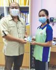 Pengurus Kumpulan Kanan, Bahagian Sumber Manusia dan Perkhidmatan Korporat (YS/ICSB), Encik Zulkhairi bin Haji Ismail menyampaikan hadiah utama cabutan tiket bertuah yang berupa sebuah freezer kepada Puan Asiah Dumahat dari Unit Keselamatan dan Penguatkuasaan, Bahagian Sumber Manusia dan Perkhidmatan Korporat (YS/ICSB).